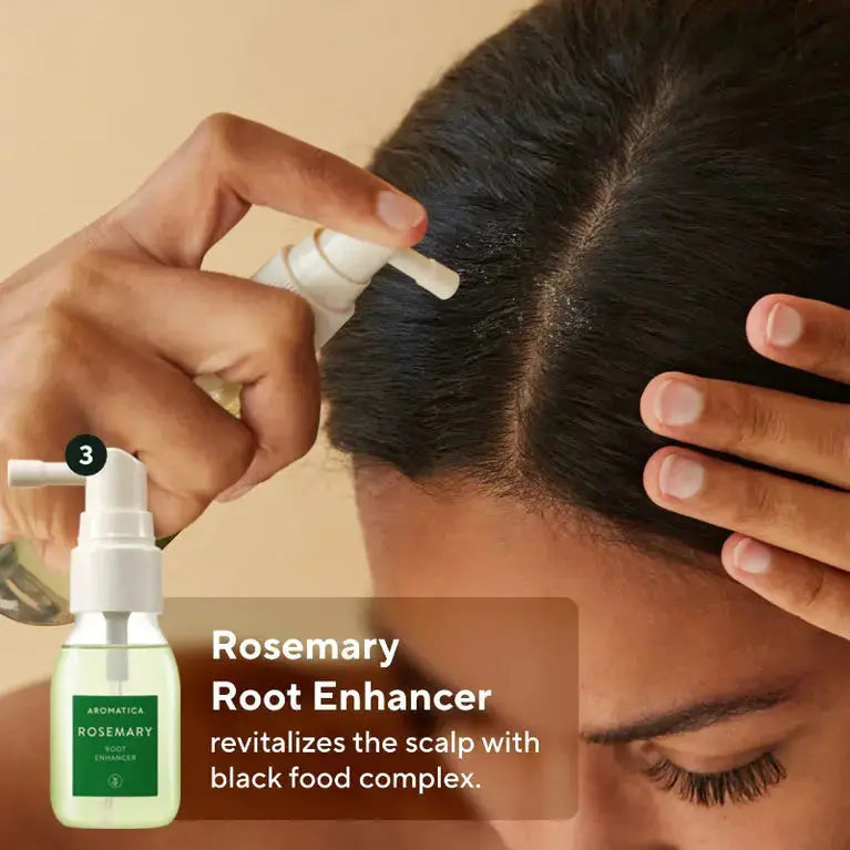 • inclut un root enhancer au romarin, un gommage pour le cuir chevelu et un shampooing scaling