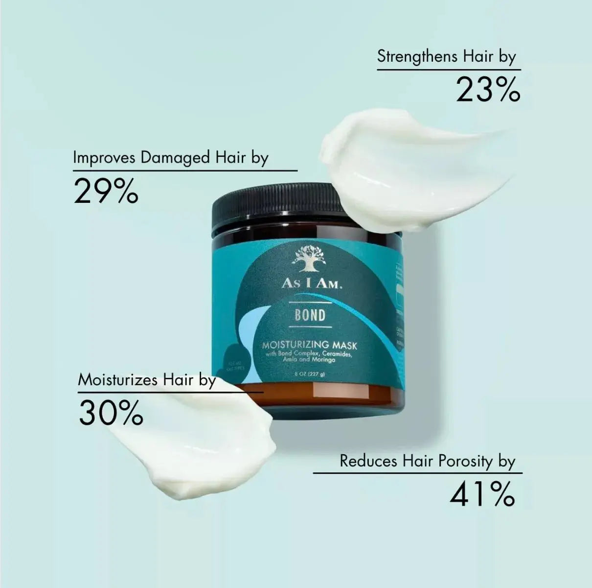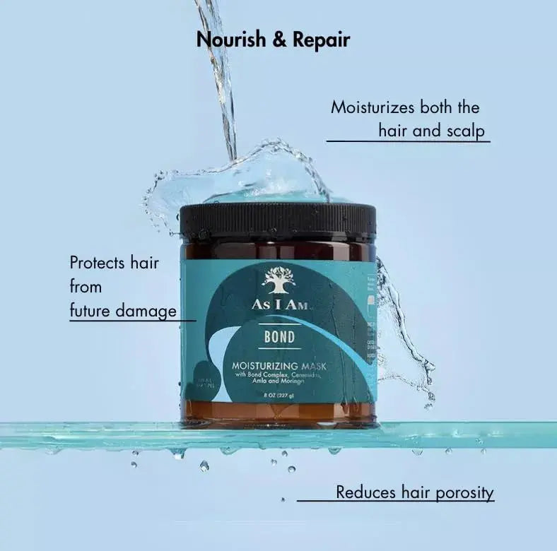 Le As I Am Bond Repair Hair Mask est un masque capillaire intensément réparateur qui nourrit en profondeur les cheveux abîmés et affaiblis et aide à les protéger contre les dommages futurs. Grâce à la advanced bond complex technology, la structure capillaire est renforcée, la porosité réduite et l’élasticité améliorée. Résultat : des cheveux plus forts, plus résistants et visiblement plus sains, mieux protégés contre les agressions quotidiennes.
