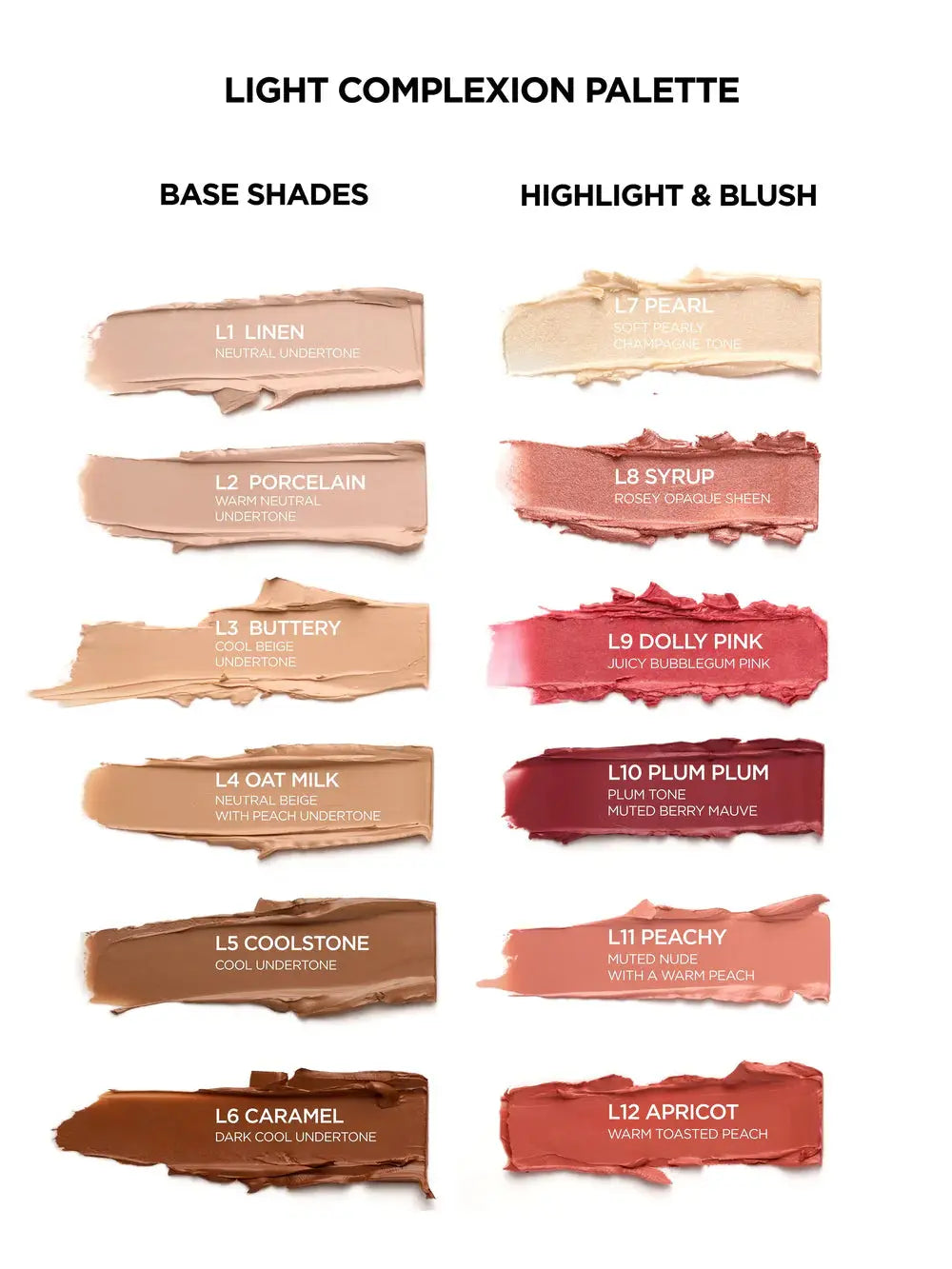 Shades L1, L2, L3, L4, L5, L6, L10, L11, L12 - Ethylhexyl Palmitate, Mica, Polyisobutene, Synthetic Wax, Paraffinum Liquidum (Mineral Oil), Paraffin, Silica, Sorbitan Olivate, Sorbitan Sesquioleate, Phenoxyethanol, Caprylyl Glycol, May Contain [+/- CI 77891 (Titanium Dioxide), CI 77492 (Iron Oxides), CI 77491 (Iron Oxides), CI 77499 (Iron Oxides), CI 15850 (Red 7 Lake), CI 15850 (Red 6 Lake)]