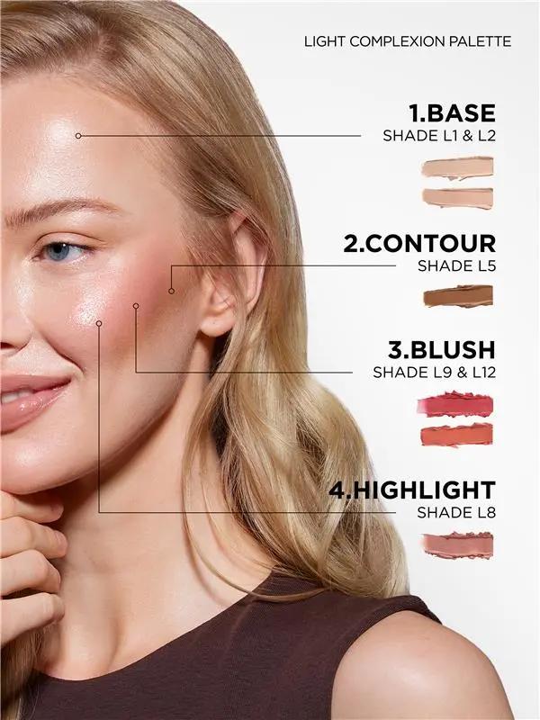Shade L9 - Ethylhexyl Palmitate, Mica, Synthetic Wax, Polyisobutene, Paraffin, Silica, Sorbitan Olivate, Sorbitan Sesquioleate, Phenoxyethanol, Caprylyl Glycol, CI 77891 (Titanium Dioxide), CI 15850 (Red 6 Lake), CI 77491 (Iron Oxides), CI 77492 (Iron Oxides), CI 77499 (Iron Oxides), CI 15850 (Red 7 Lake).