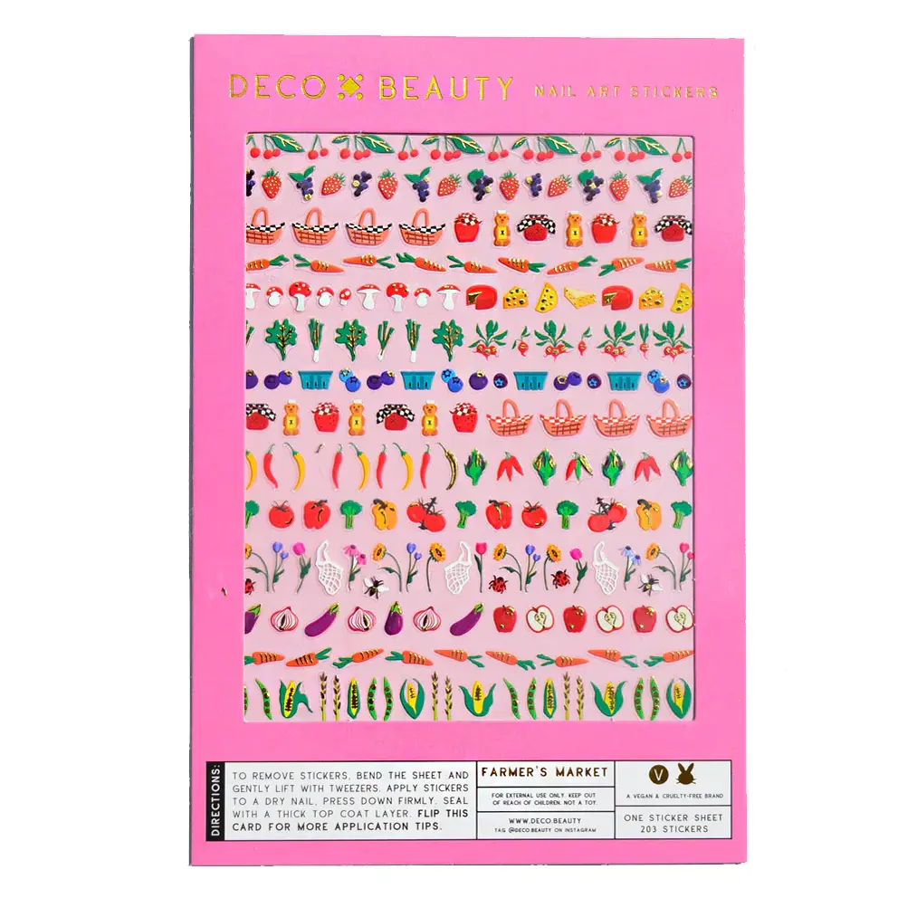 Les Deco Beauty Nail Art Stickers Farmer's Market sont parfaits pour tous ceux qui adorent le nail art ludique et gourmand. Cette feuille de stickers est remplie de mini designs de fruits et légumes avec de subtils accents dorés qui donnent à votre manucure un look unique et tendance.