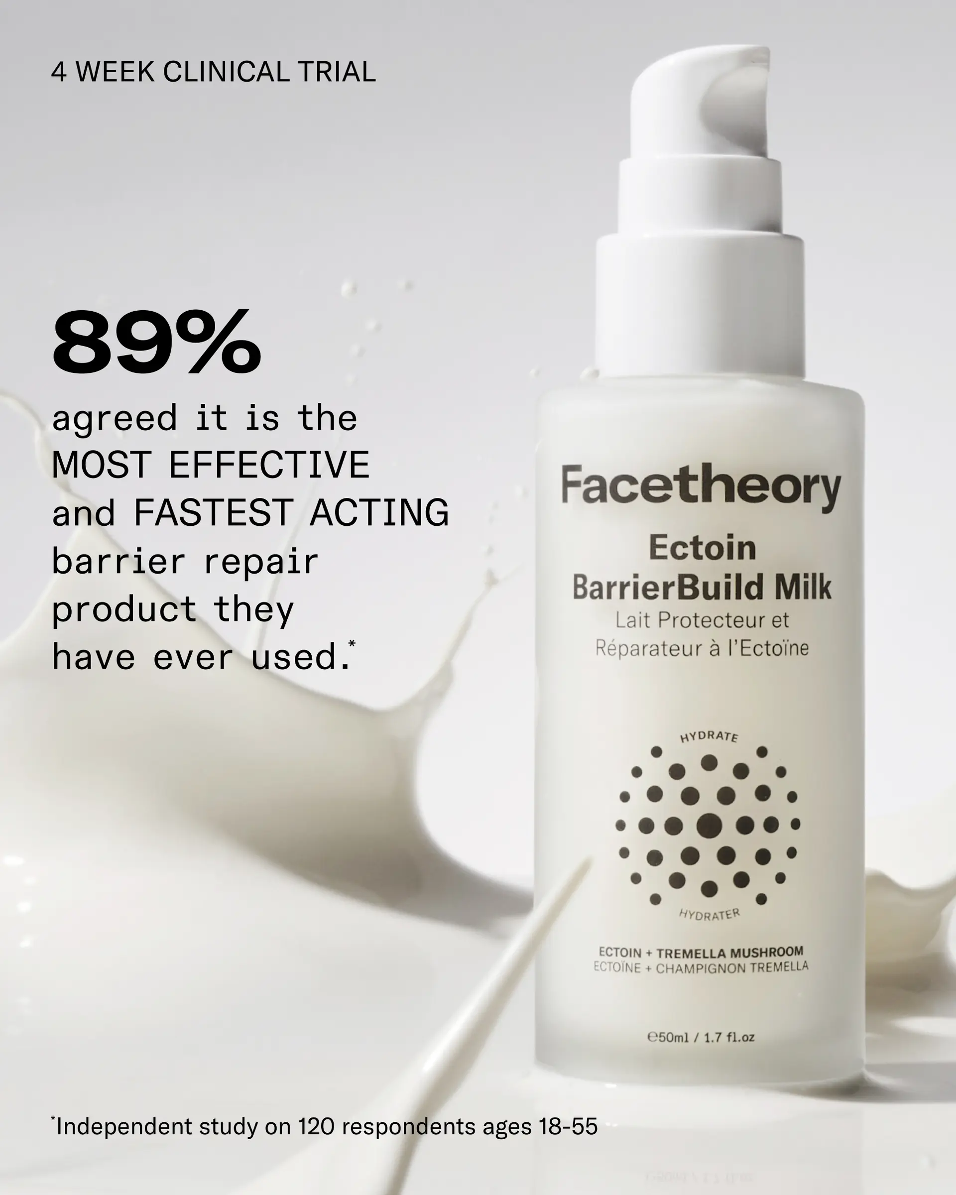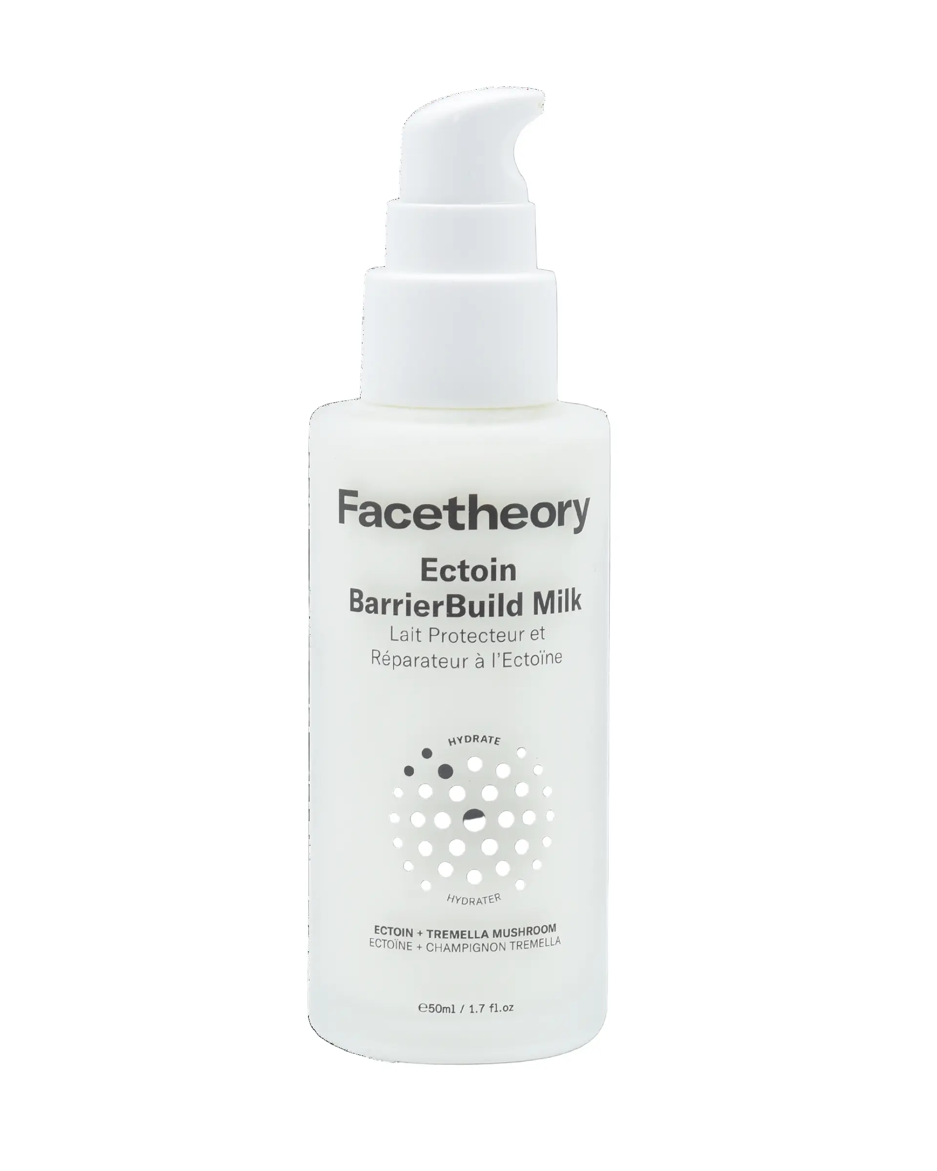 Le Facetheory Ectoin BarrierBuild Milk est un lait ultra-léger et soyeux qui fond dans la peau tout en travaillant intensément à réparer la barrière cutanée. Cliniquement prouvé : en seulement 4 heures, la barrière est renforcée, idéal en cas de rougeurs, sécheresse ou sensibilité accrue.