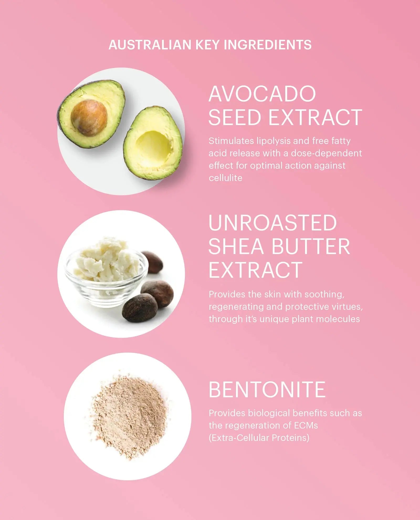 Aqua, Glycerin, Persea Gratissima Oil, Prunus Armeniaca Kernel Oil, Undecane, Tridecane, Cetearyl Olivate, Butyrospermum Parkii Butter, Caprylic/Capric Triglyceride, Cetearyl Alcohol, Sorbitan Olivate, Tocopherol, Cetyl Alcohol, Polysorbate 20, Bentonite, Parfum, Theobroma Cacao Seed Butter, Stearic Acid, DMDM Hydantoin, Carbomer, Butyrospermum Parkii Butter Extract, Persea Gratissima Fruit Extract, Alcohol, Terminalia Ferdinandiana Fruit Extract, Xanthan Gum, Potassium Sorbate, Centella Asiatica Extract, Citric Acid, Citronellol, Geraniol, Limonene, Linalool.
