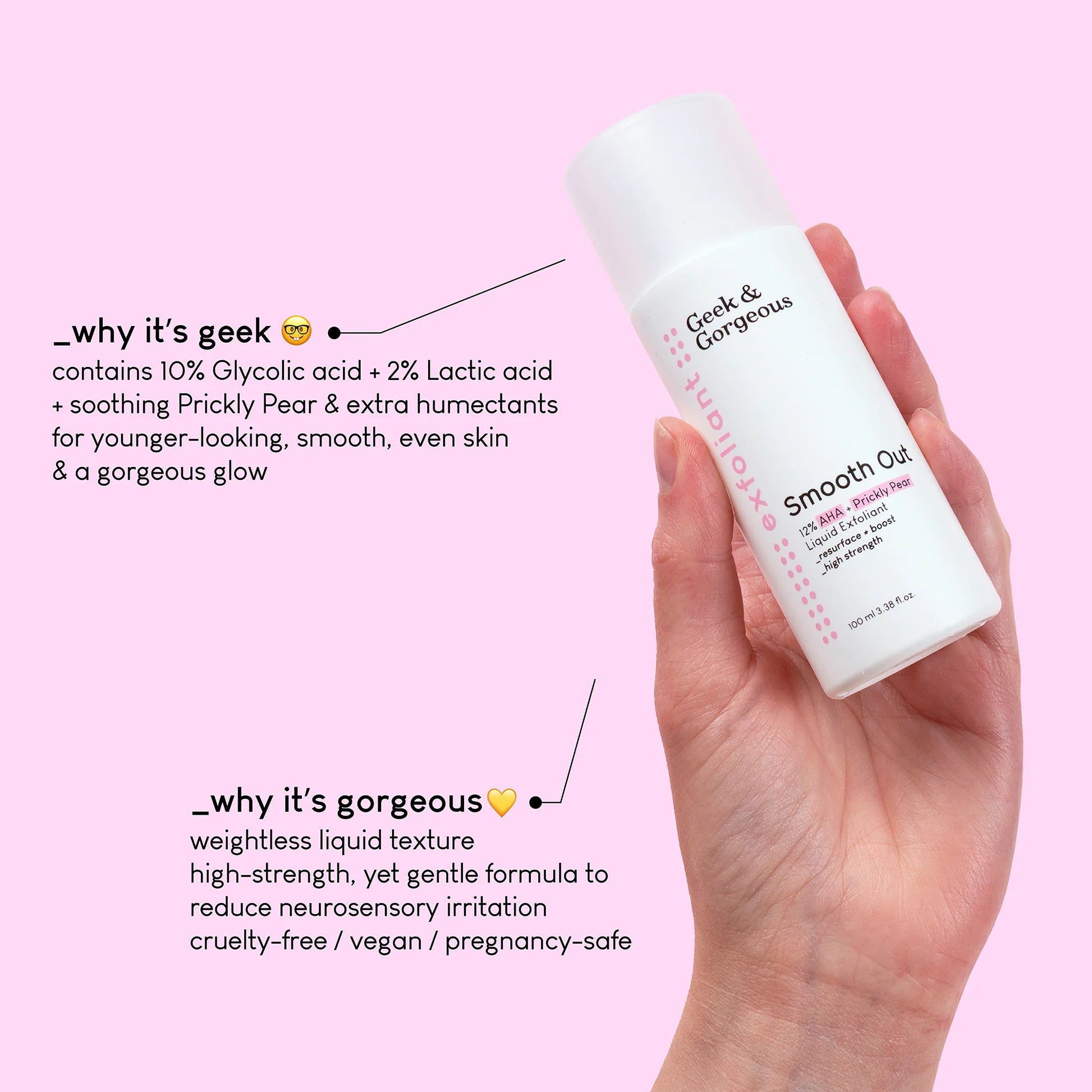 Le Geek & Gorgeous Smooth Out AHA Exfoliant est un exfoliant liquide qui élimine en douceur les cellules mortes de votre peau et procure un éclat naturel ! L'exfoliant convient à tous les types de peau, mais peut être assez agressif pour les peaux sensibles. Vous utilisez cet exfoliant lorsque vous souffrez de peau terne, de ridules, de cernes et de taches sur votre peau.