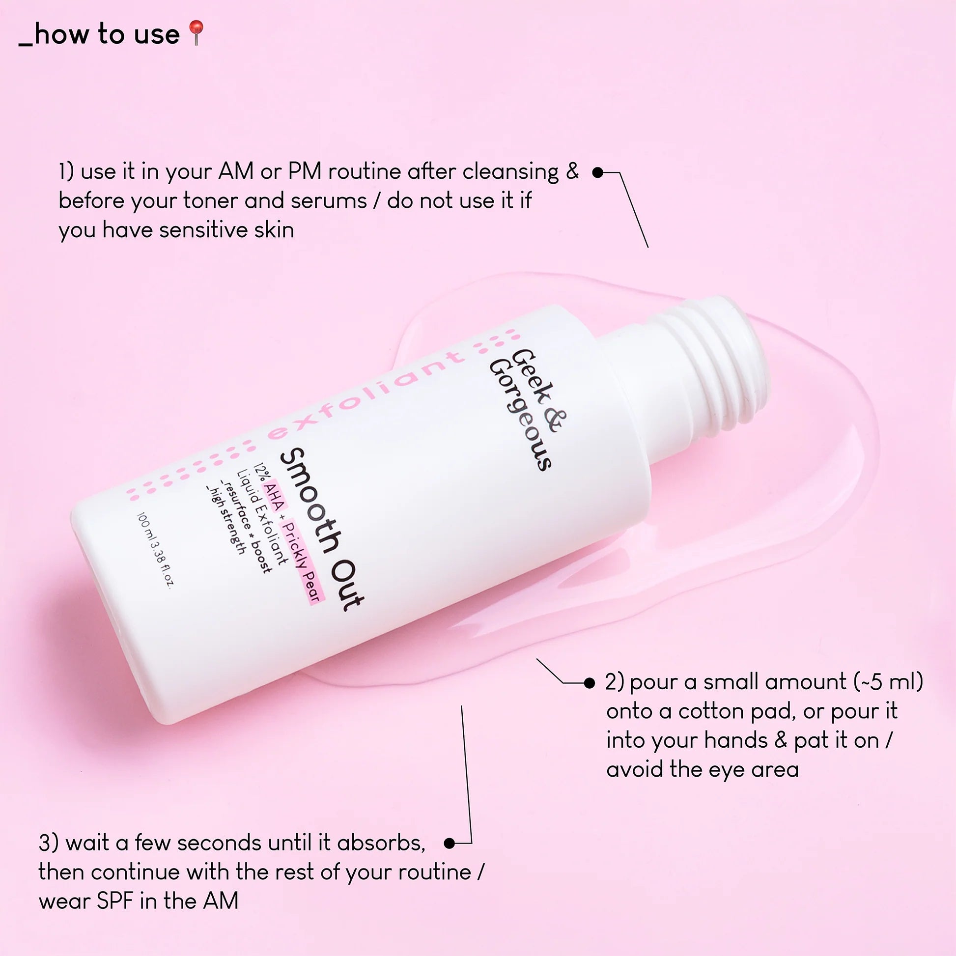 Appliquez une petite quantité sur un coton ou sur vos mains, puis tamponnez l'exfoliant sur votre peau. Évitez la zone autour de vos yeux.