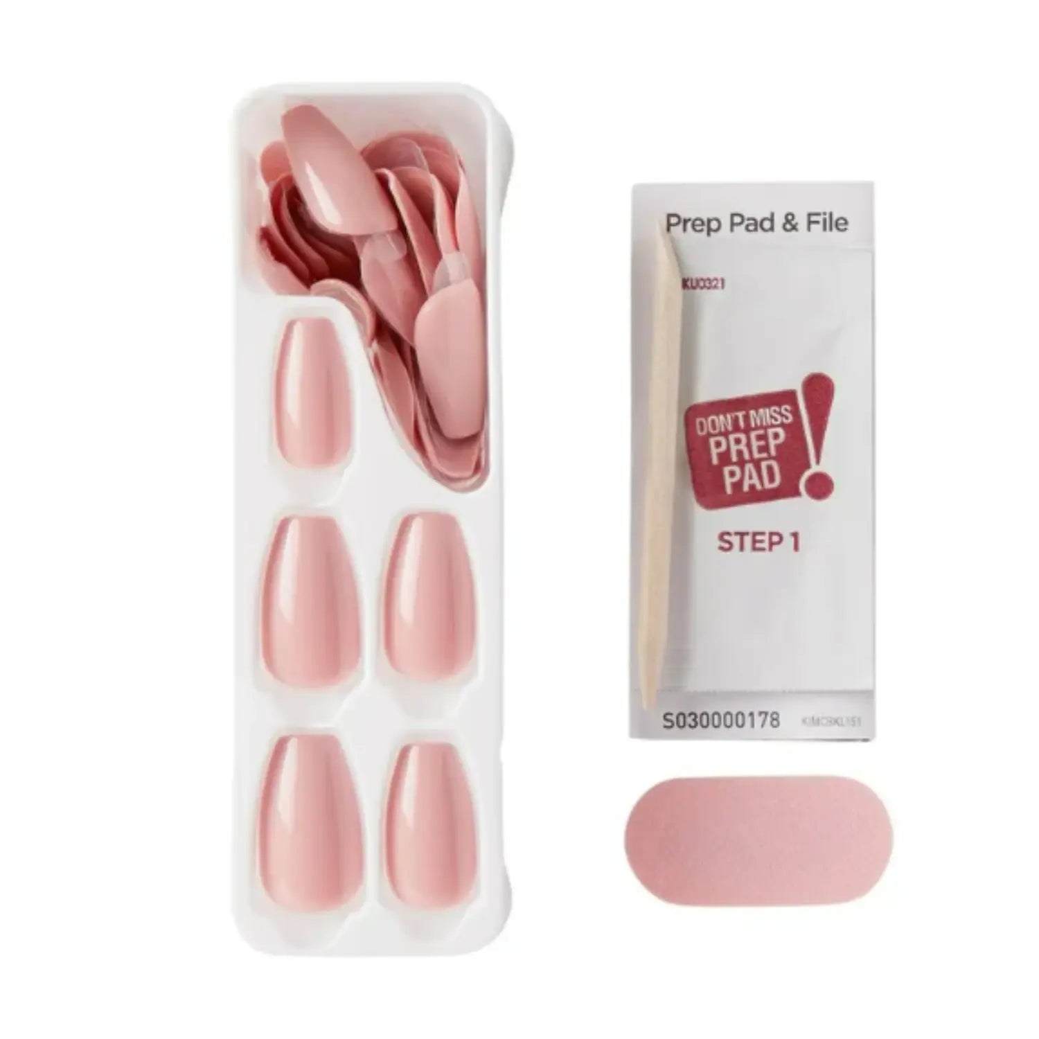 - contient 30 ongles de tailles variées, un prep pad et un bâtonnet de manucure
