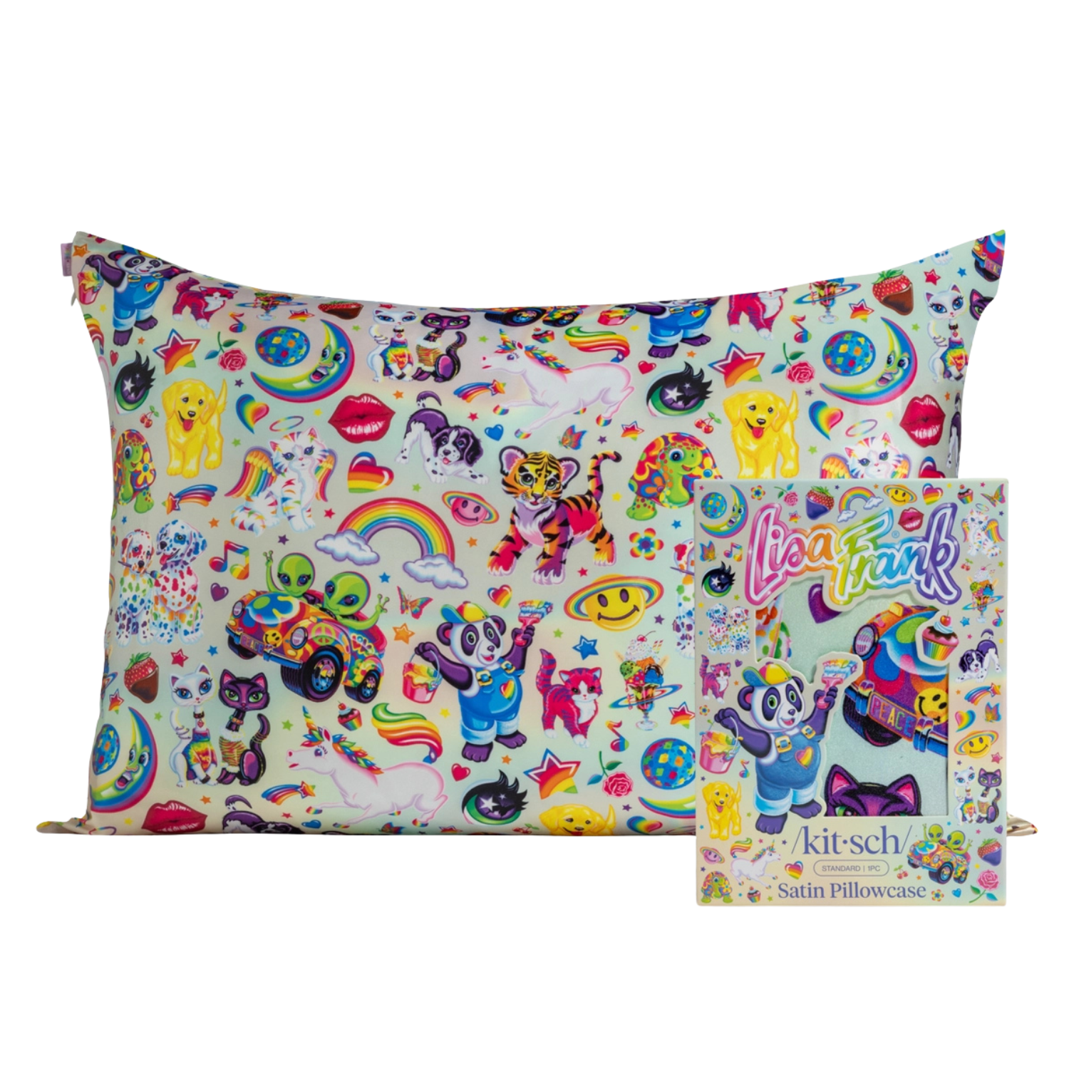 La taie d’oreiller Kitsch x Lisa Frank Satin Pillowcase The Fantastic World Of Lisa Frank est le retour en enfance ultime: avec une touche beauté ! Cette taie en satin est décorée d’un joyeux collage de tous tes personnages Lisa Frank préférés : prêts à t’accompagner chaque nuit dans tes rêves les plus colorés. Parfaite pour toutes celles qui aiment le fun, le flair et une chevelure fabulous.