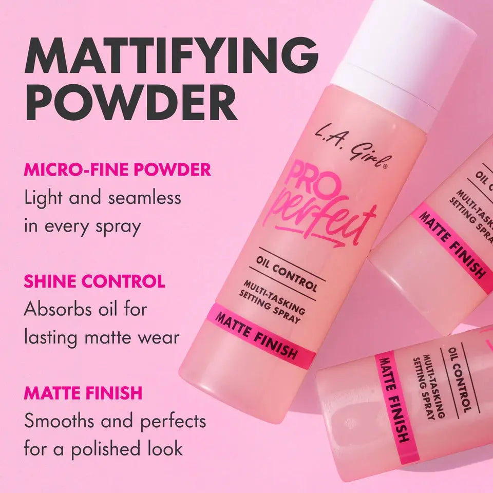 Le LA Girl Pro Perfect Setting Spray Blurring Matte est ton arme secrète pour une finition mate impeccable qui tient toute la journée. Ce spray fixateur innovant contient un complexe de poudres intégré qui adoucit la texture de la peau et floute les pores pour un effet soft focus sans assécher la peau.