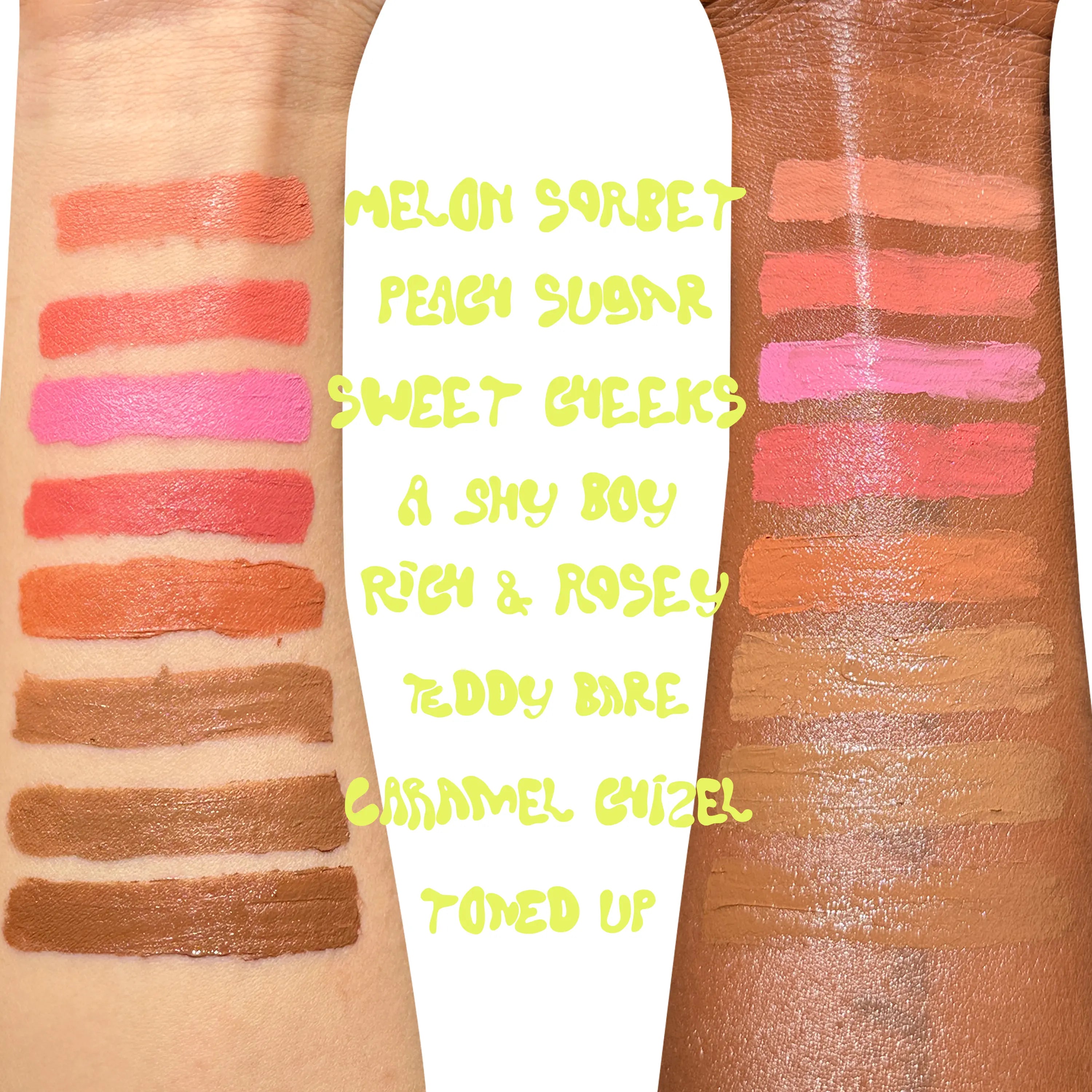 Hexyl Laurate, Silica, Hydrogenated Polydecene, Phenyl Trimethicone, Isononyl Isononanoate, Synthetic Fluorphlogopite, Hydrogenated Polyisobutene, Ozokerite, Polyethylene, Dimethicone, Bismuth Oxychloride, Dimethicone Crosspolymer, Glyceryl Behenate/Eicosadioate, Tocopheryl Acetate, BHT, [+/-: Titanium Dioxide (CI 77891), Iron Oxides (CI 77491) (CI 77492) (CI 77499), Red 6 (CI 15850), FD&C Yellow No. 5 (CI 19140:1), Red 21 (CI 45380:3), Red 27 (CI 45410:2), Yellow 6 (CI 15985:1)].