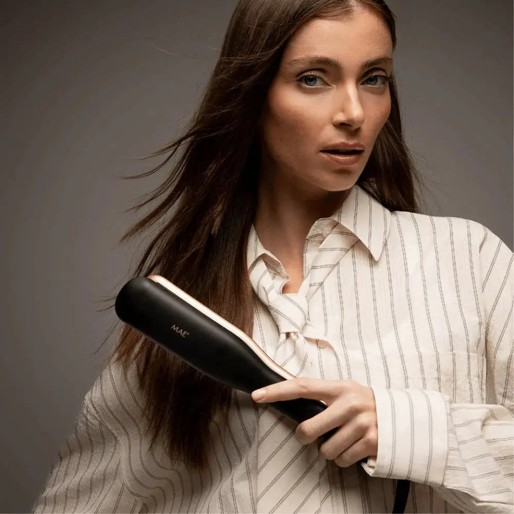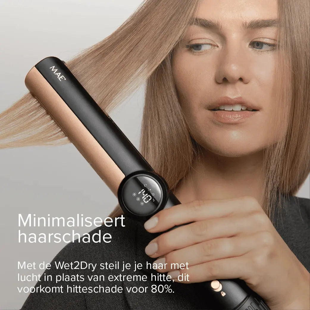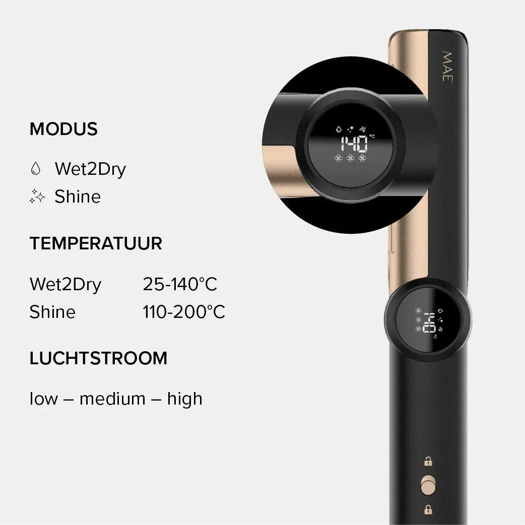 Le MAE Wet2Dry est ta solution rapide pour des cheveux lisses et brillants: sans avoir besoin de les sécher au préalable. Cet outil intelligent sèche et lisse tes cheveux en même temps grâce à une technologie d’air innovante, parfait pour les matins pressés ou quand tu veux éviter les tracas. Avec le mode Wet2Dry spécial (25–140°C), tu obtiens un look lisse en un rien de temps, même sur cheveux mouillés. Bye sèche-cheveux, bonjour multitool !