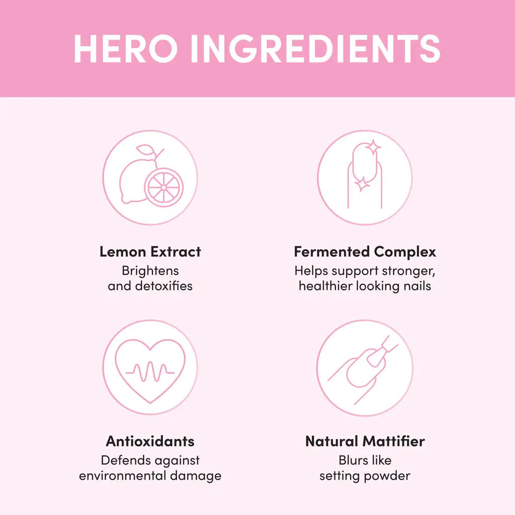 La formule est riche en ingrédients bienfaisants comme le Lemon Extract éclaircissant, des Antioxidants et des actifs fermentés qui renforcent et protègent vos ongles. Elle sèche ultra rapidement, est légère et modulable si vous souhaitez plus de couvrance. En bref : votre incontournable pour des ongles frais instantanément – no filter needed !