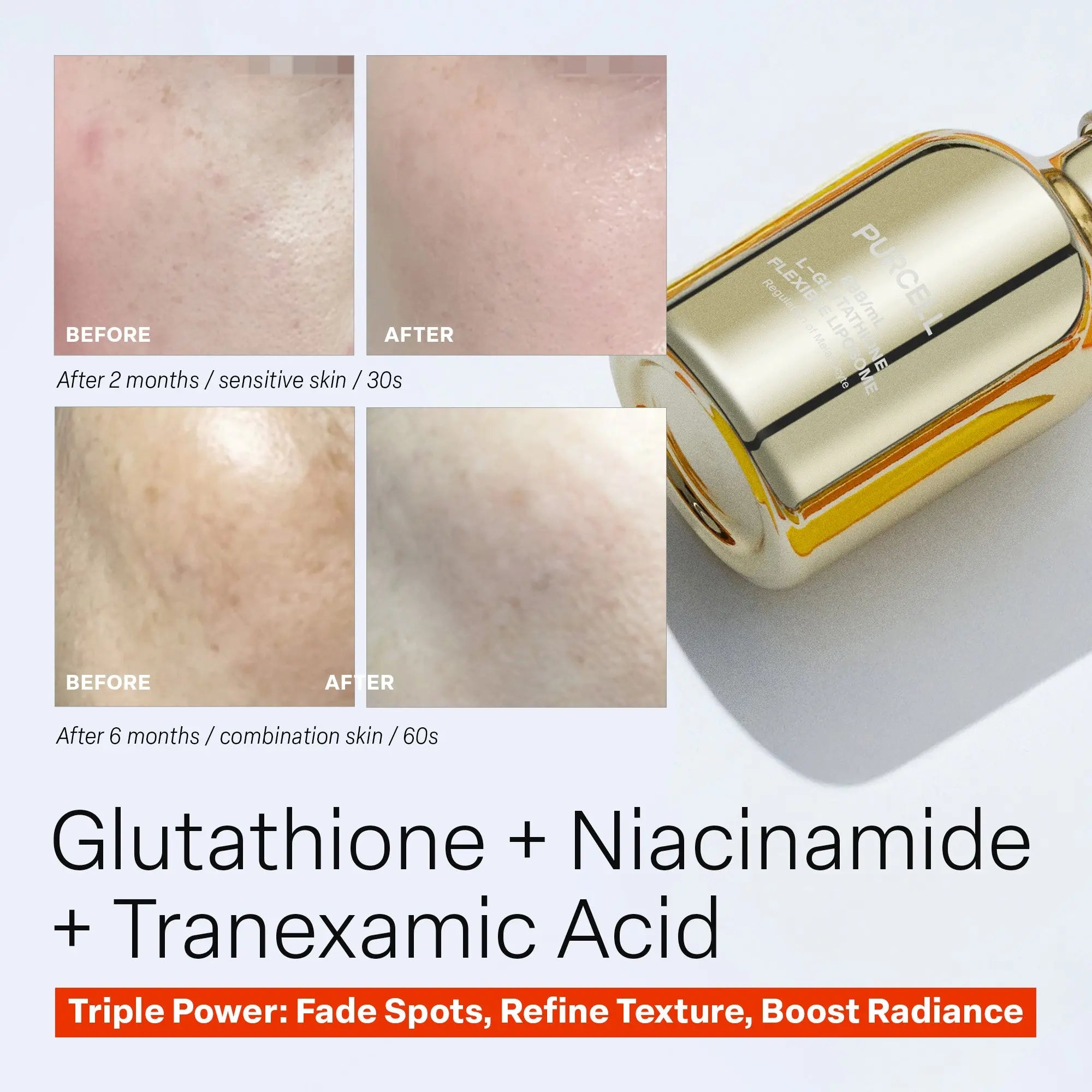 Le sérum Purcell 88b/ml L-Glutathione Flexible Liposome est votre nouvel indispensable skincare pour une peau lumineuse, uniforme et éclatante. Cette formule revitalisante tout-en-un est riche en ingrédients puissants qui agissent ensemble pour éclaircir, unifier et nourrir la peau: sans l’agresser.