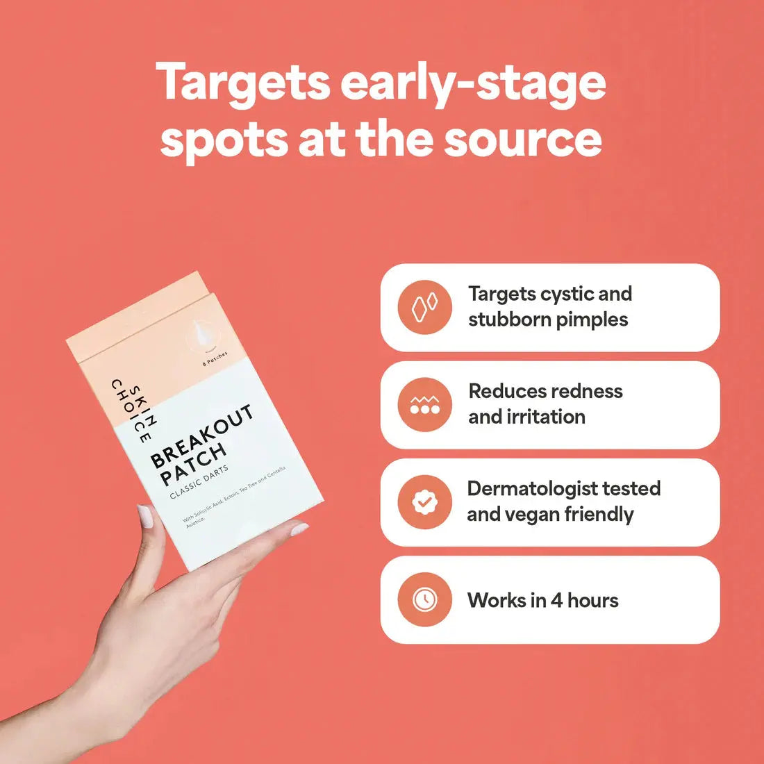 Le Skin Choice Breakout Patch Classic Darts est ton arme secrète contre les boutons dès les premiers signes. Grâce à la technologie innovante des microdarts ce patch pénètre directement dans la peau pour cibler les imperfections avant qu’elles ne se développent complètement. Chaque patch contient un mélange puissant d’actifs pour traiter le bouton à la source tout en apaisant et hydratant la peau.