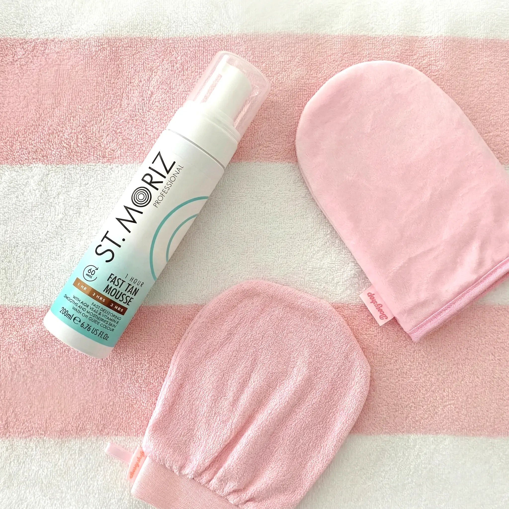 - Applique une petite quantité de la St. Moriz Fast Tanning Mousse sur le Boozyshop Tanning Mitt.