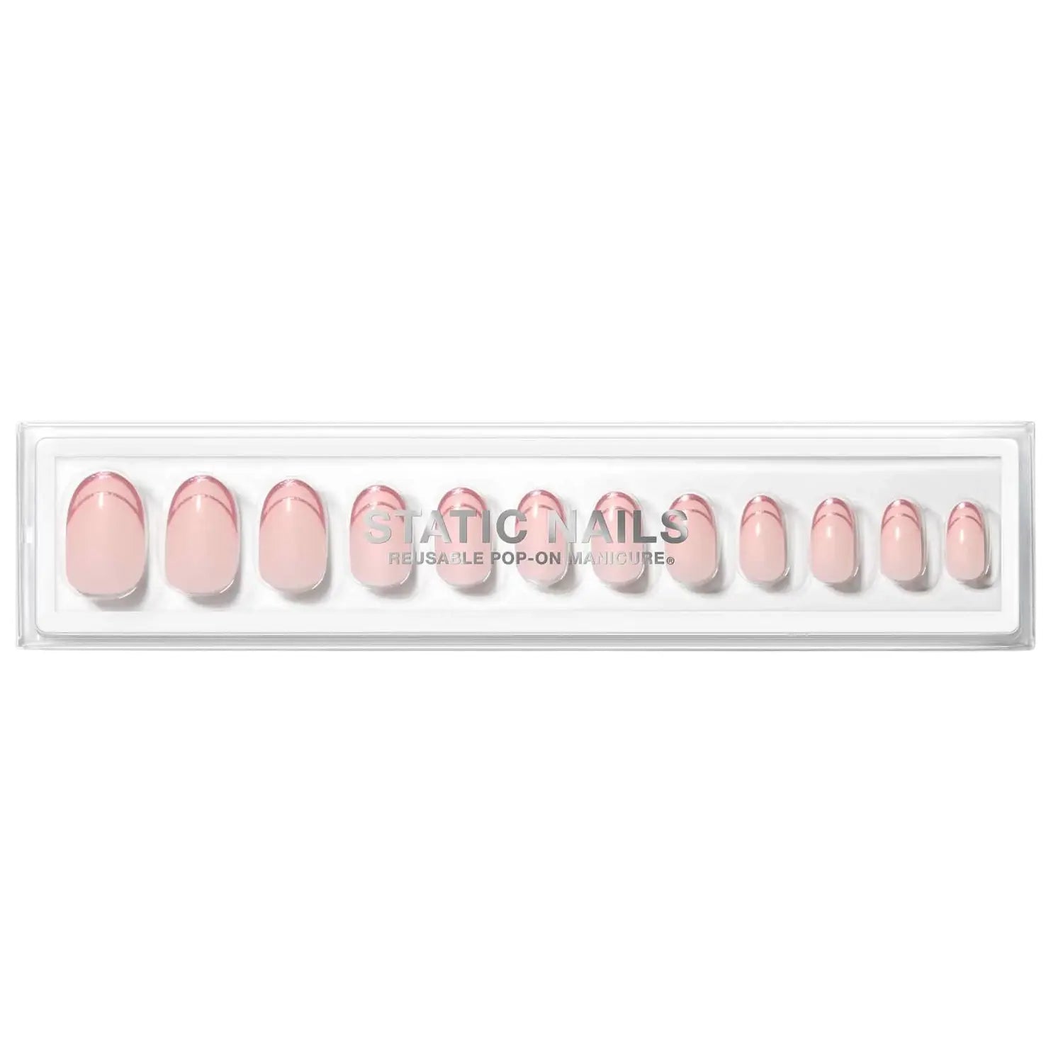 La Static Nails Reusable Pop-On Manicure Rose Gold Double French Round allie élégance et innovation pour une manucure nouvelle génération que vous pouvez appliquer vous-même à la maison. Ces ongles pop-on effet acrylique ont une forme ronde classique et un design double French chic avec une touche moderne en or rose : ultra tendance et parfaits pour toutes les occasions.