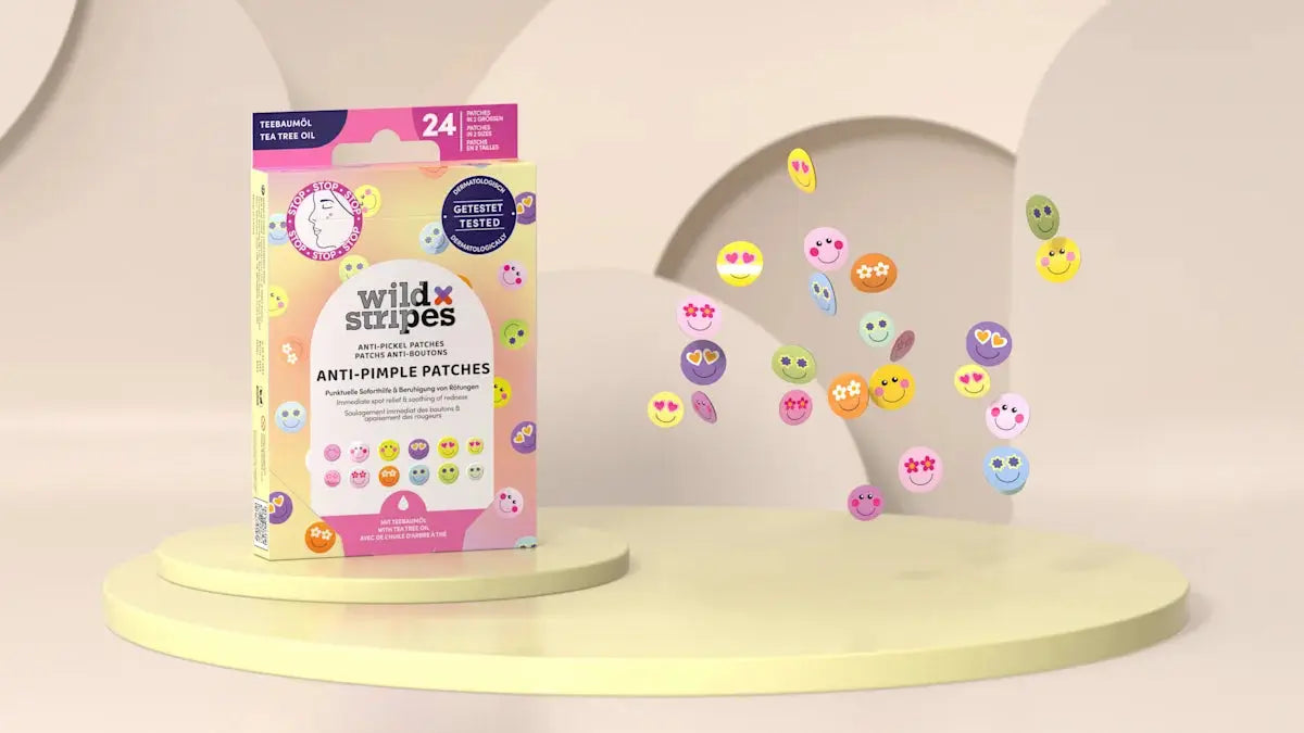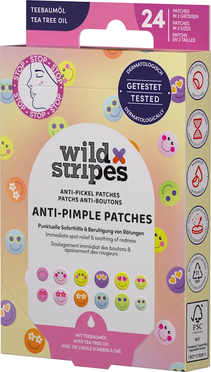 Les Wild Stripes Anti-Pimple Patches Smile Prevent sont parfaits pour un soin rapide et ciblé des boutons et des rougeurs. Ces patches aident à apaiser la peau immédiatement et protègent les imperfections contre la saleté et les agressions extérieures, permettant à la peau de se calmer plus rapidement.