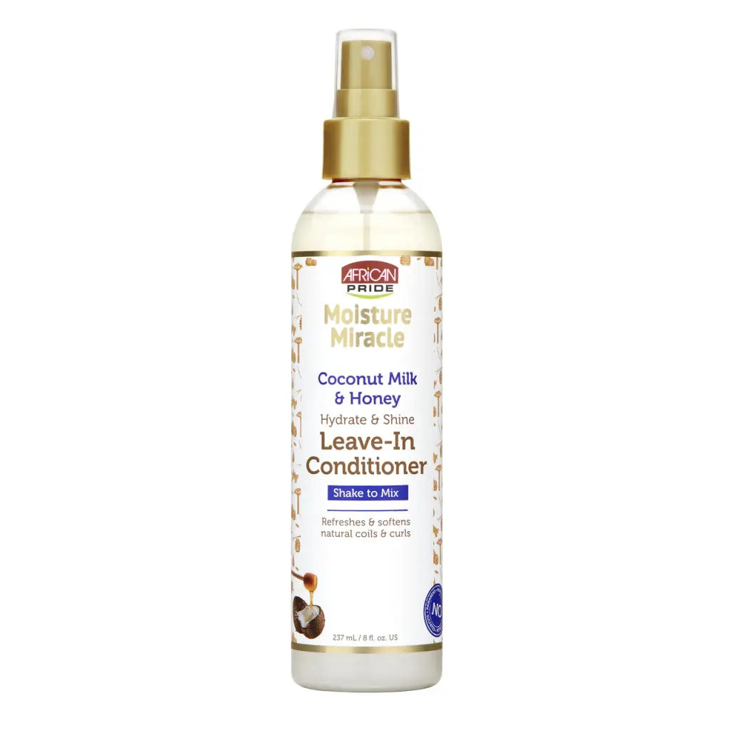 De African Pride Moisture Miracle Leave-In Conditioner Spray is jouw snelle oplossing voor dorstige, futloze krullen die wel een oppepper kunnen gebruiken. Deze fijne spray is ideaal voor dagelijks gebruik en perfect voor wanneer je haar wat extra hydratatie en liefde nodig heeft.