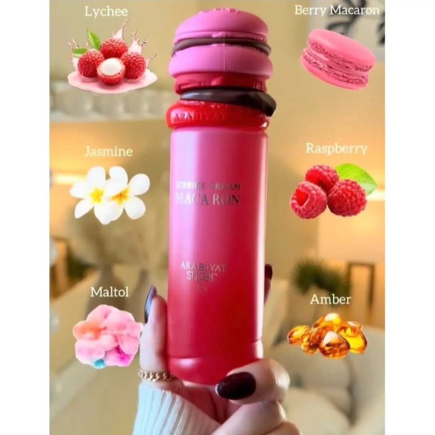 De geur opent fris en sappig met lychee voor een stralende eerste indruk. In het hart smelten raspberry en jasmine samen met maltol, wat doet denken aan een zachte macaron gevuld met rode vruchten en romige crème. De basis wordt moderner en luchtiger dankzij ambergris, ambroxan en evernyl, waardoor de geur clean, verslavend en elegant blijft hangen. De pastelroze macaron-flacon maakt deze geur extra cute en onweerstaanbaar.