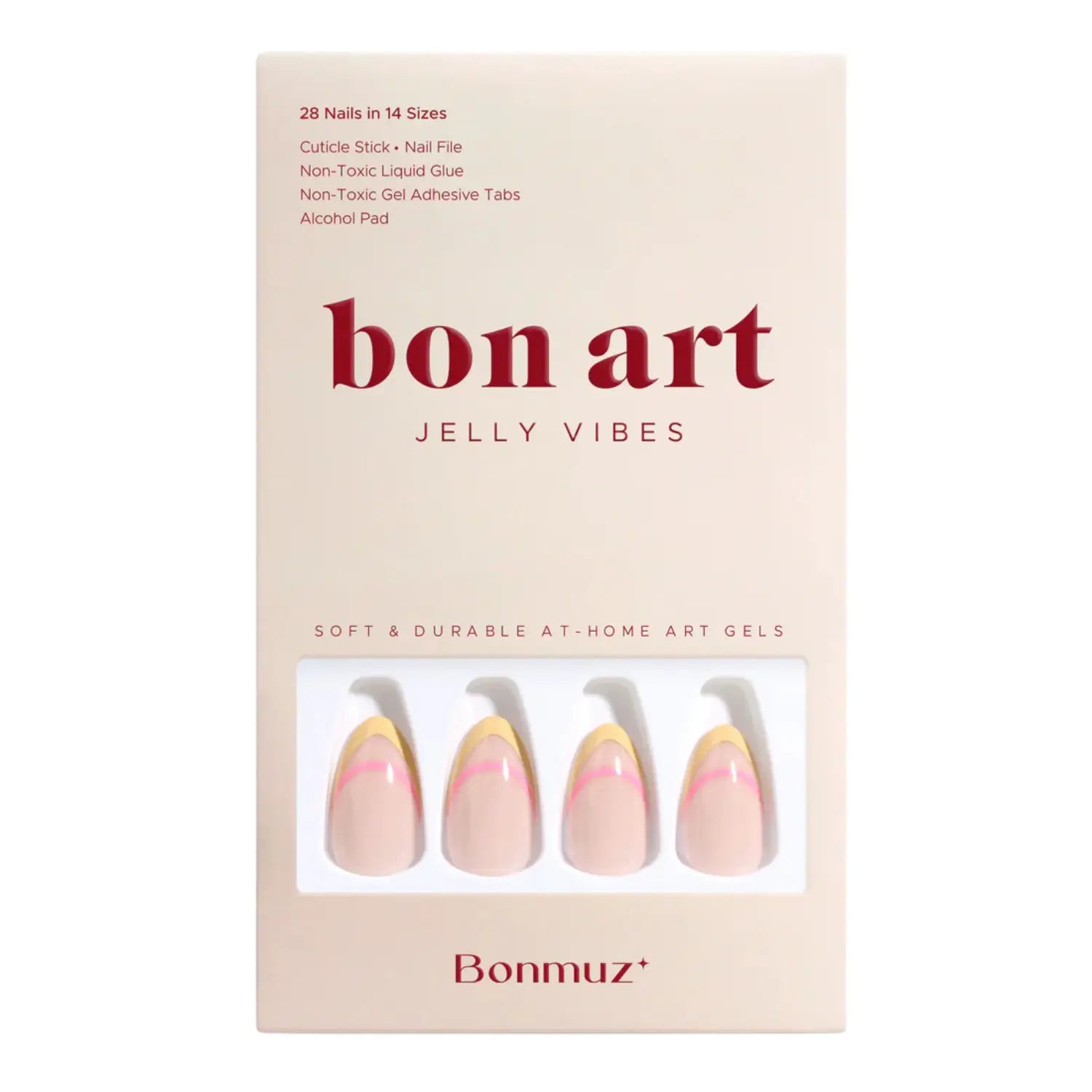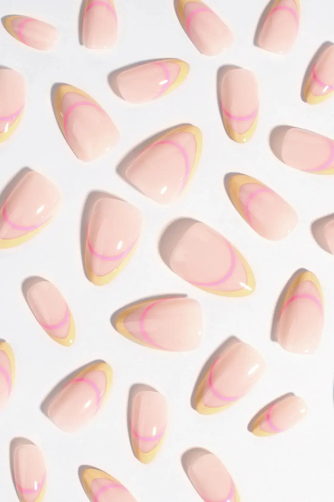 De Bonmuz Press-On Nails Tango Twist zijn een energieke mix van vibrant pink en electrifying yellow die direct een speelse, opvallende vibe geven. De dunne lijn langs de rand zorgt voor een subtiel, verfijnd detail dat het design net dat beetje extra finesse geeft.