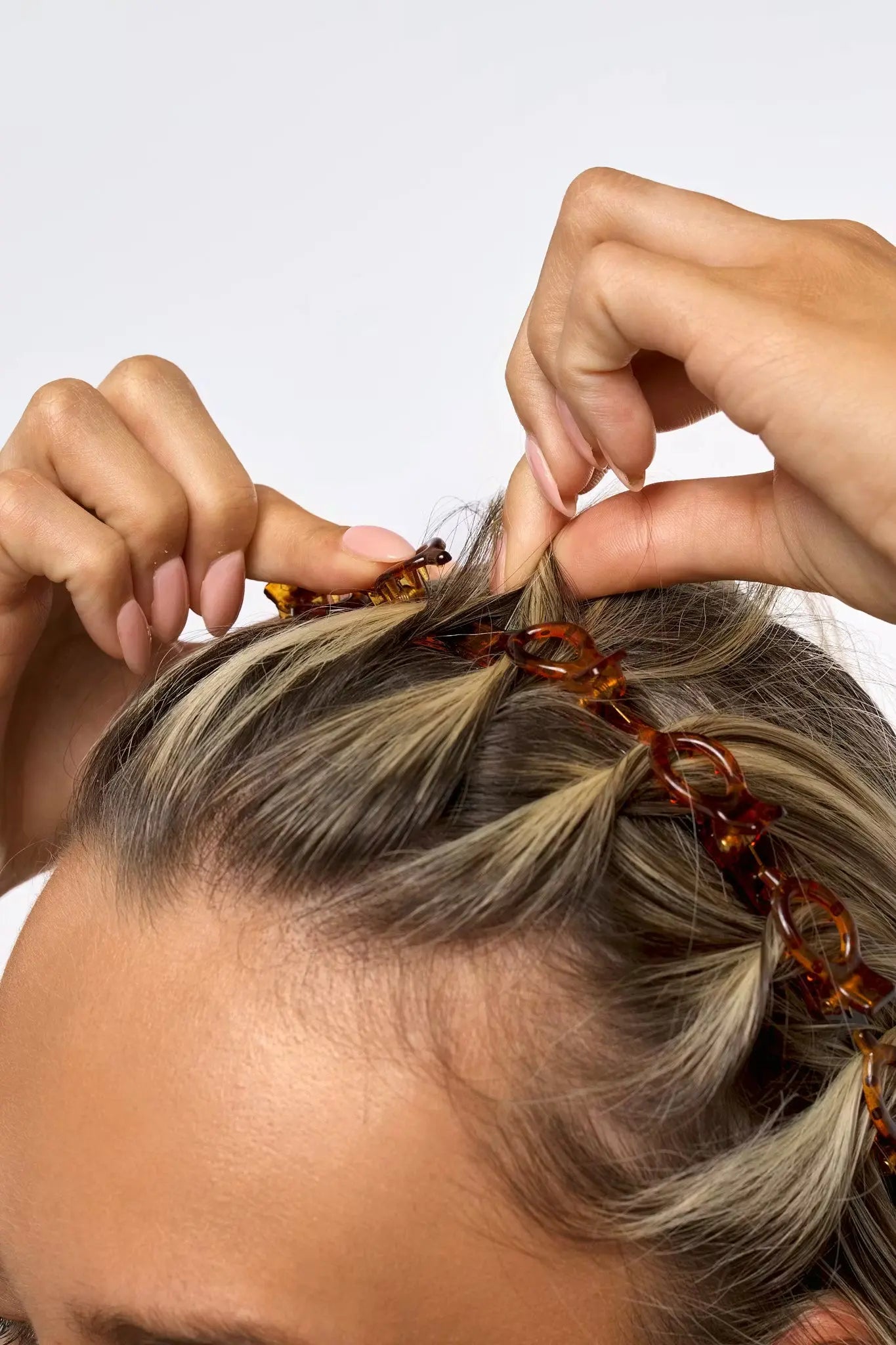 - Neem kleine plukjes haar, draai ze subtiel in en klik ze vast met de ingebouwde butterfly clips.