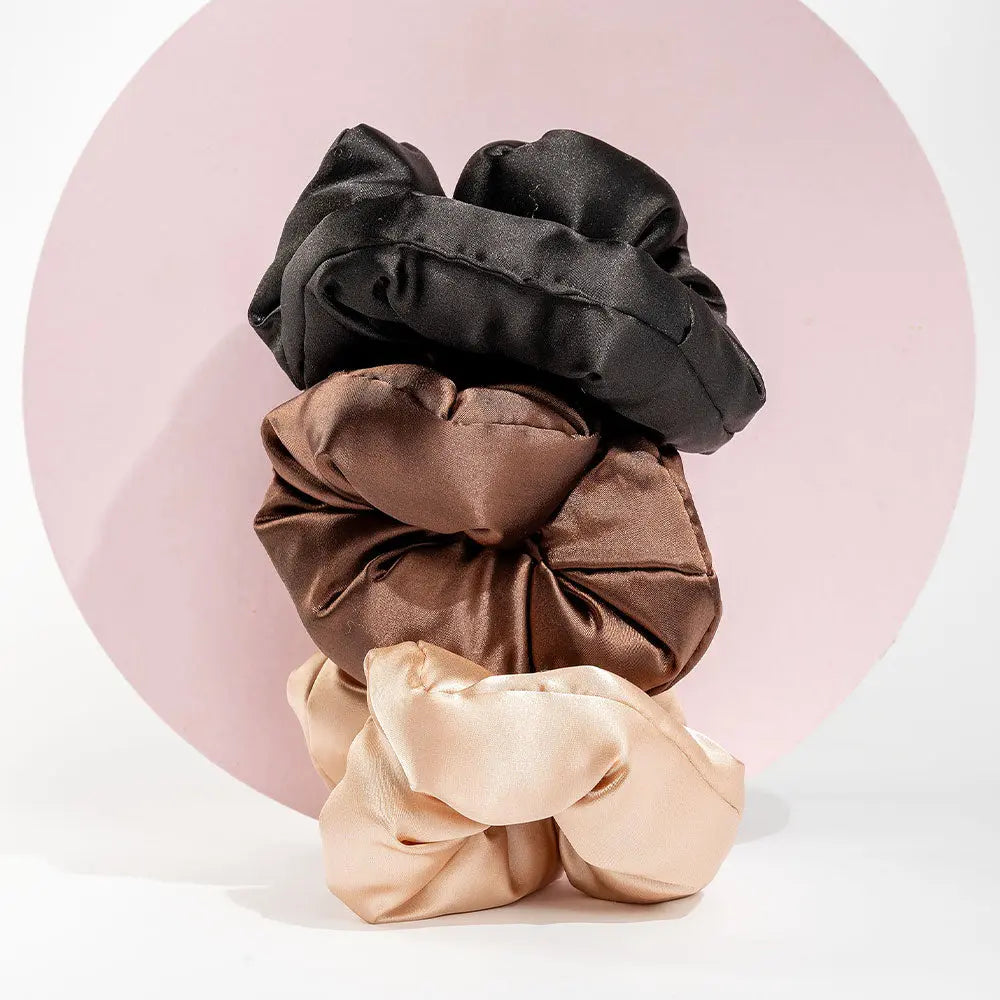 De set bevat drie scrunchies in mooie neutrale tinten die bij elke look passen. Dankzij het comfortabele, gewatteerde design zijn ze perfect voor overdag, tijdens het relaxen thuis of zelfs tijdens het slapen. Zo help je knikken en afdrukken in je haar te voorkomen en blijft je haar mooi glad.