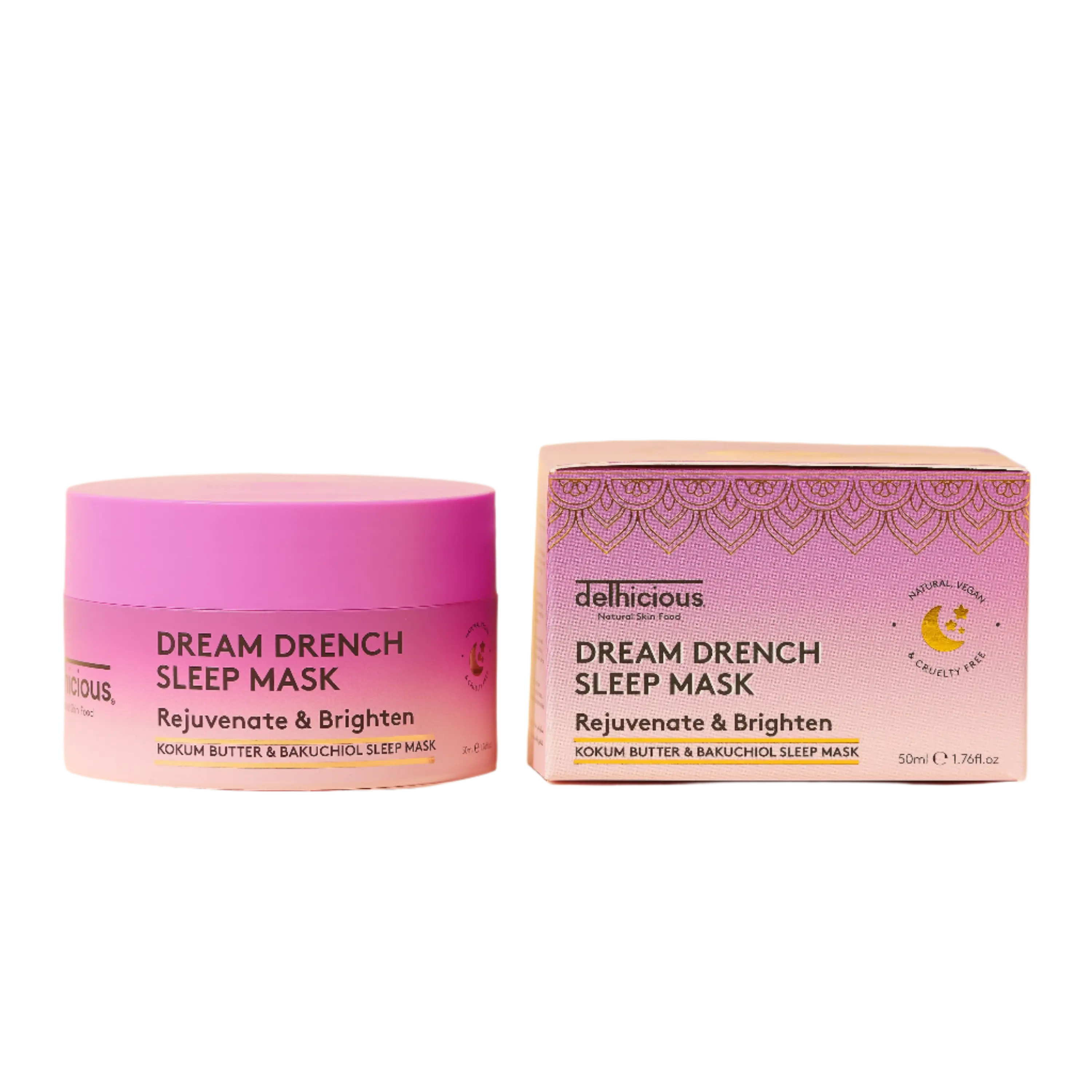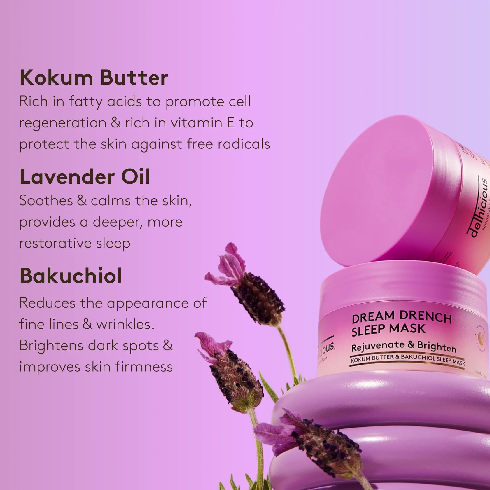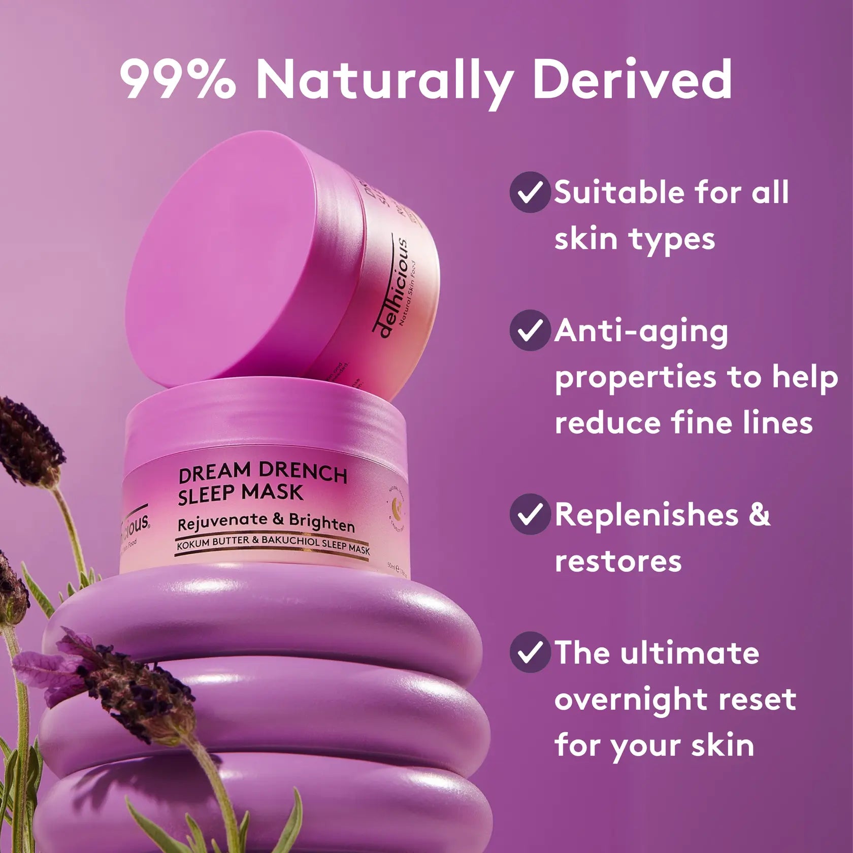 De Delhicious Dream Drench Sleep Mask is jouw ultieme nachtverzorging voor een stralende, herstelde huid bij het ontwaken! Deze luxe overnight treatment voedt en kalmeert je huid intens met een krachtige mix van kokumboter, lavendelolie en bakuchiol, een natuurlijk alternatief voor retinol.