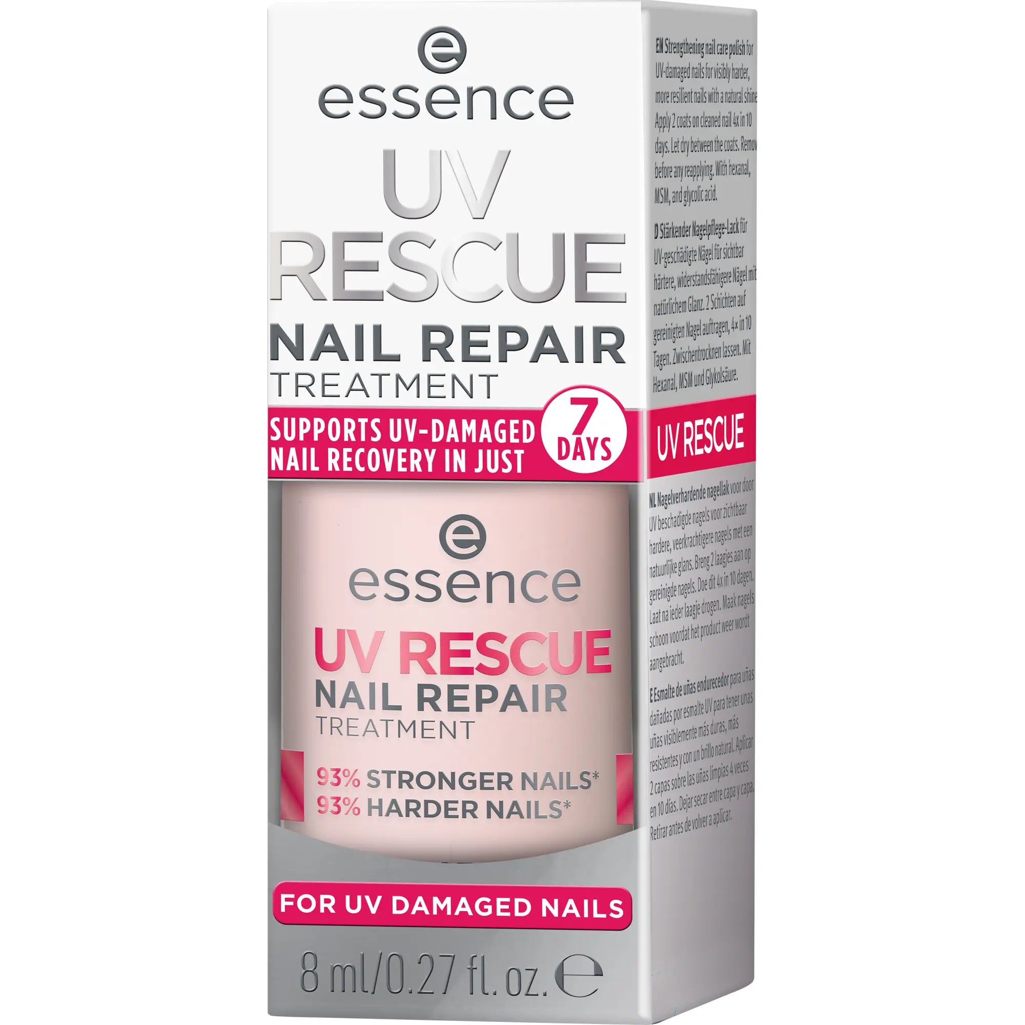 De Essence UV Rescue Nail Repair Treatment 01 is dé redding voor nagels die wel wat liefde kunnen gebruiken na UV-gel manicures. Deze verzorgende treatment in een zachte lichtroze tint geeft je nagels niet alleen een prachtige, natuurlijke glans, maar helpt ook actief bij het herstellen van beschadigde nageloppervlakken.