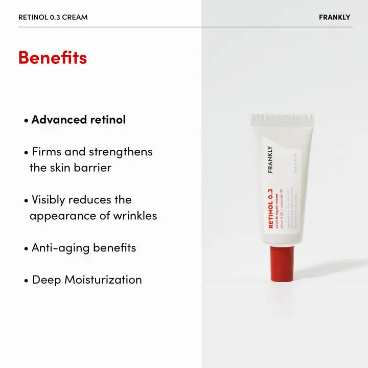 De FRANKLY Retinol 0.3 Cream is een krachtige anti-aging must-have voor de ervaren retinolgebruiker. Met 0.3% pure retinol (9.000 IU/g) pakt deze crème effectief fijne lijntjes, rimpels, dofheid en pigmentvlekken aan. Het resultaat? Een stevigere huid barrière, een gladdere huidtextuur en zichtbaar minder tekenen van huidveroudering.