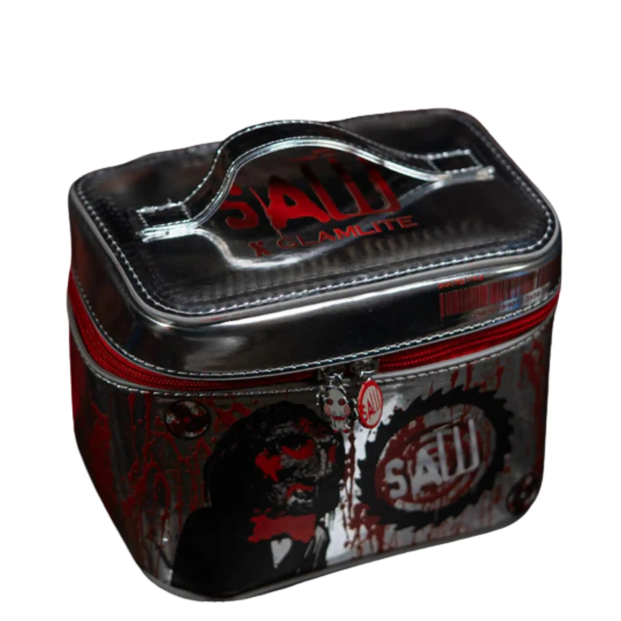 De Glamlite x SAW Bag is de ultieme musthave voor elke horrorfan met een zwak voor make-up. Deze zilver-chrome make-up bag is bedekt met bloedspetters en de binnenkant is bekleed met een all-over print van Jigsaw’s gezicht. Creepy, stylish en totally iconic.