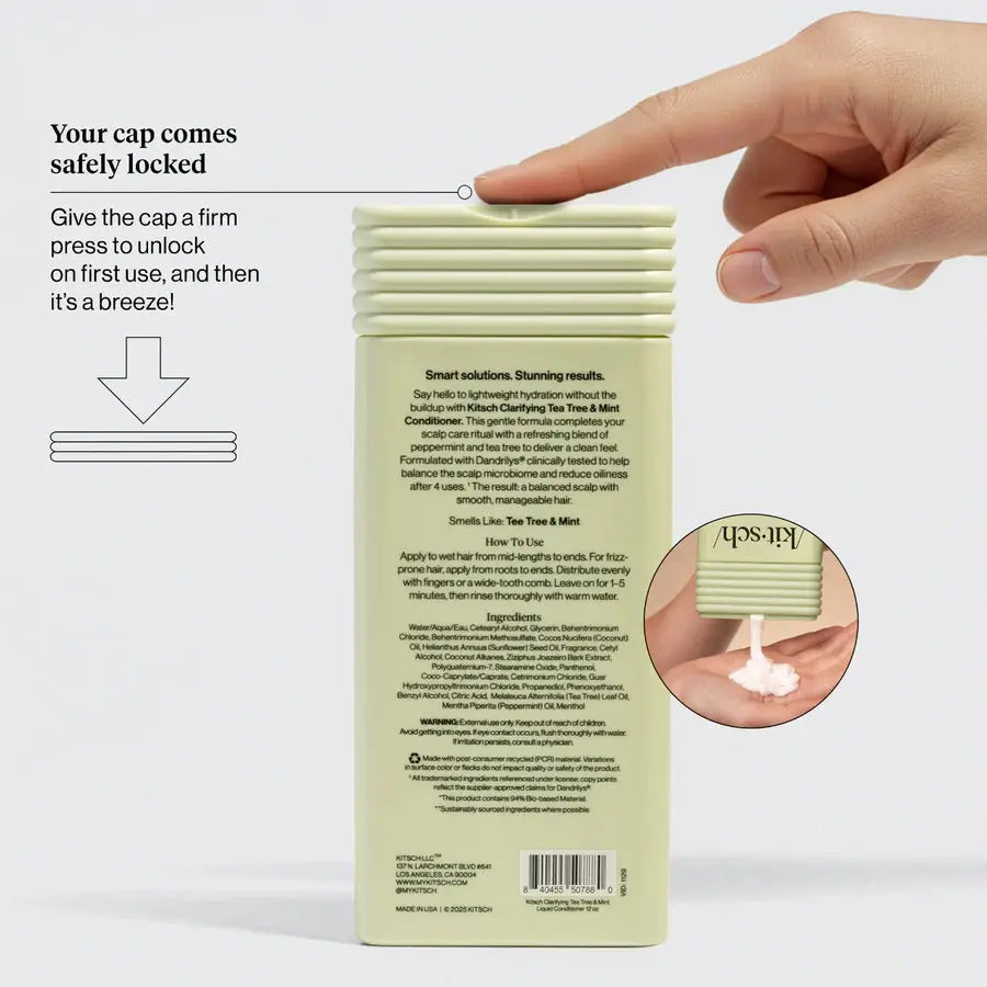 De Kitsch Clarifying Tea Tree & Mint Conditioner is jouw frisse reset voor een gezonde hoofdhuid en licht, luchtig haar. Deze conditioner biedt precies genoeg hydratatie zonder build-up en is perfect voor wie snel last heeft van vet haar of productresten. Dankzij Dandrilys®, een krachtig plantaardig ingrediënt, wordt overtollige olie aangepakt en voelt je hoofdhuid na vier keer gebruiken al merkbaar in balans.