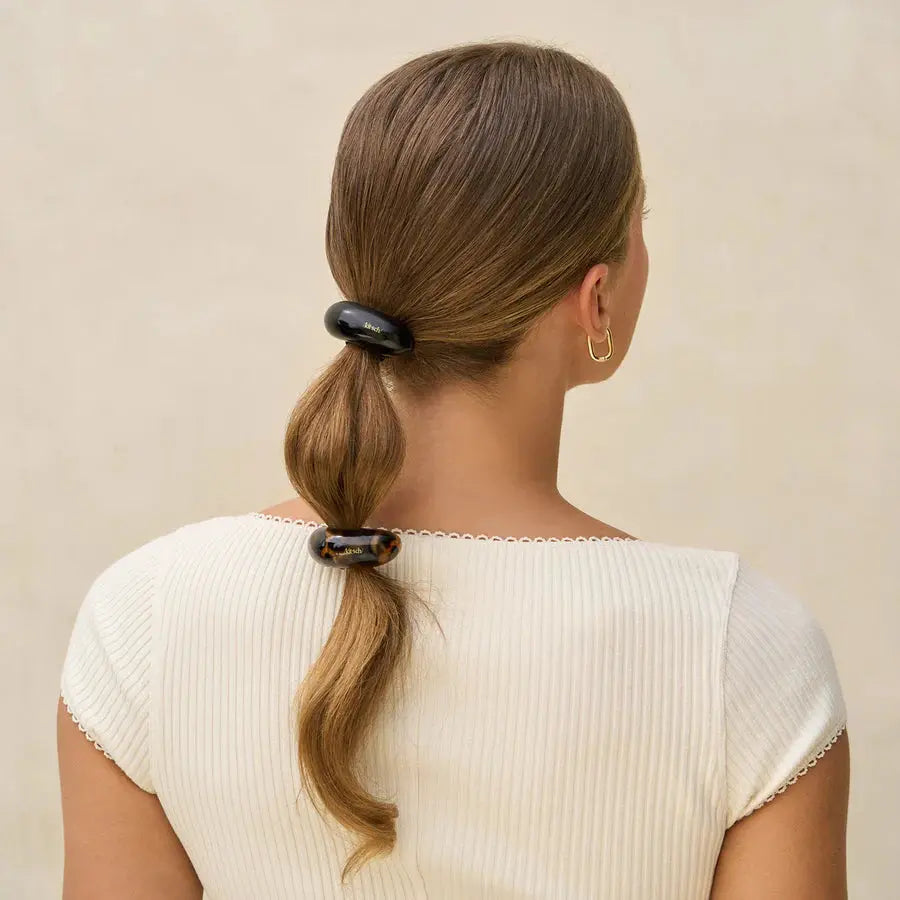 De Kitsch Cloud Cuffs Black & Tort Medium geven jouw kapsel in één simpele beweging een stijlvolle upgrade. Deze set van twee elegante cuffs in zwart en tort is perfect voor het creëren van een moderne, minimalistische look: of je nu gaat voor een strakke paardenstaart, nonchalante bun of chique vlecht. Instant chic, zonder gedoe!