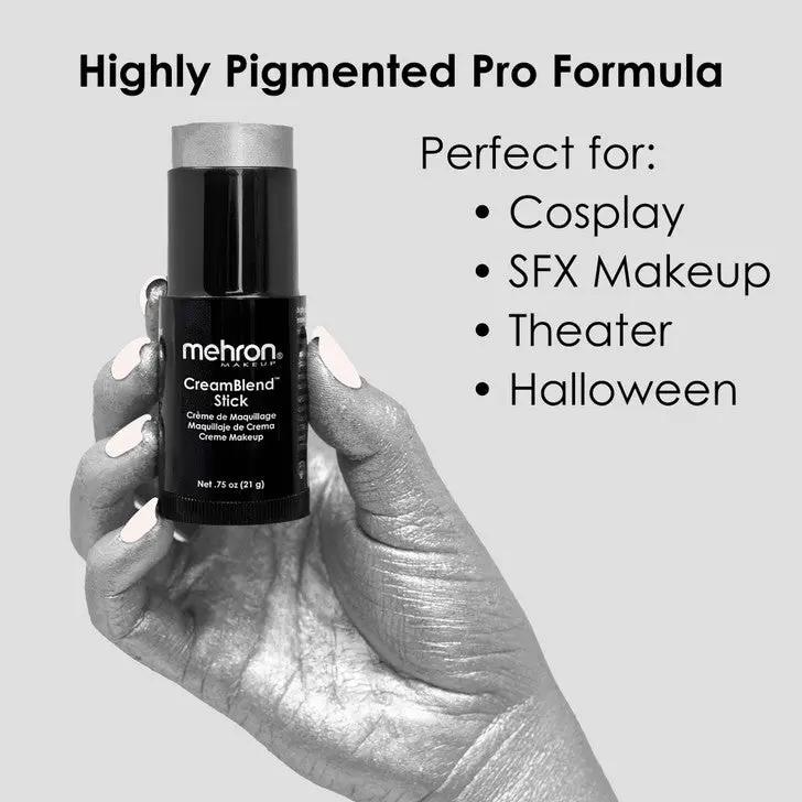 De Mehron Makeup CreamBlend Stick Silver is een iconische, professioneel geliefde cream make-up in stickvorm. Deze supergepigmenteerde formule biedt volledige dekking en is speciaal ontwikkeld om bestand te zijn tegen extreme omstandigheden, zoals felle podiummake-up of lange draaidagen. Of je nu op het podium staat, een cosplay personage tot leven brengt of een creatieve Halloween-look neerzet: deze stick doet het allemaal.