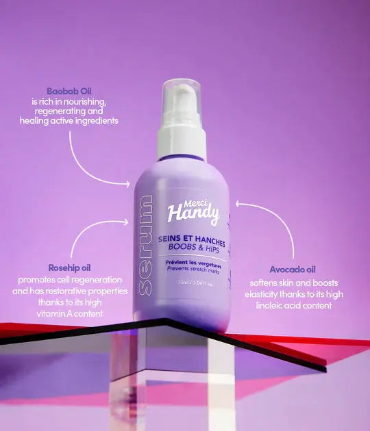 De Merci Handy Body Serum Breasts & Hips is jouw nieuwe bodycare bestie voor de zones die vaak worden vergeten, maar zóveel liefde verdienen! Dit huid perfectionerende serum is speciaal ontwikkeld voor borsten, heupen (en eigenlijk elk gebied dat wat extra aandacht kan gebruiken) en helpt bij het verminderen van zichtbare striae en littekens. Say hello to zachte, soepele en elastische huid!