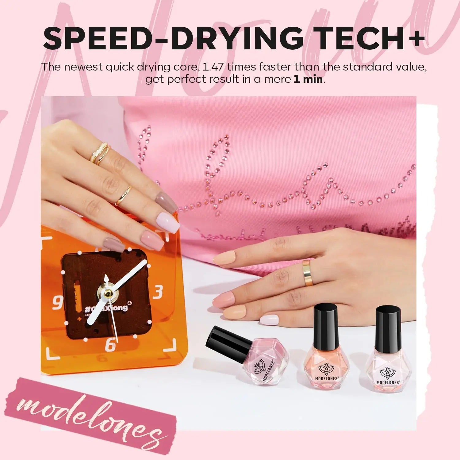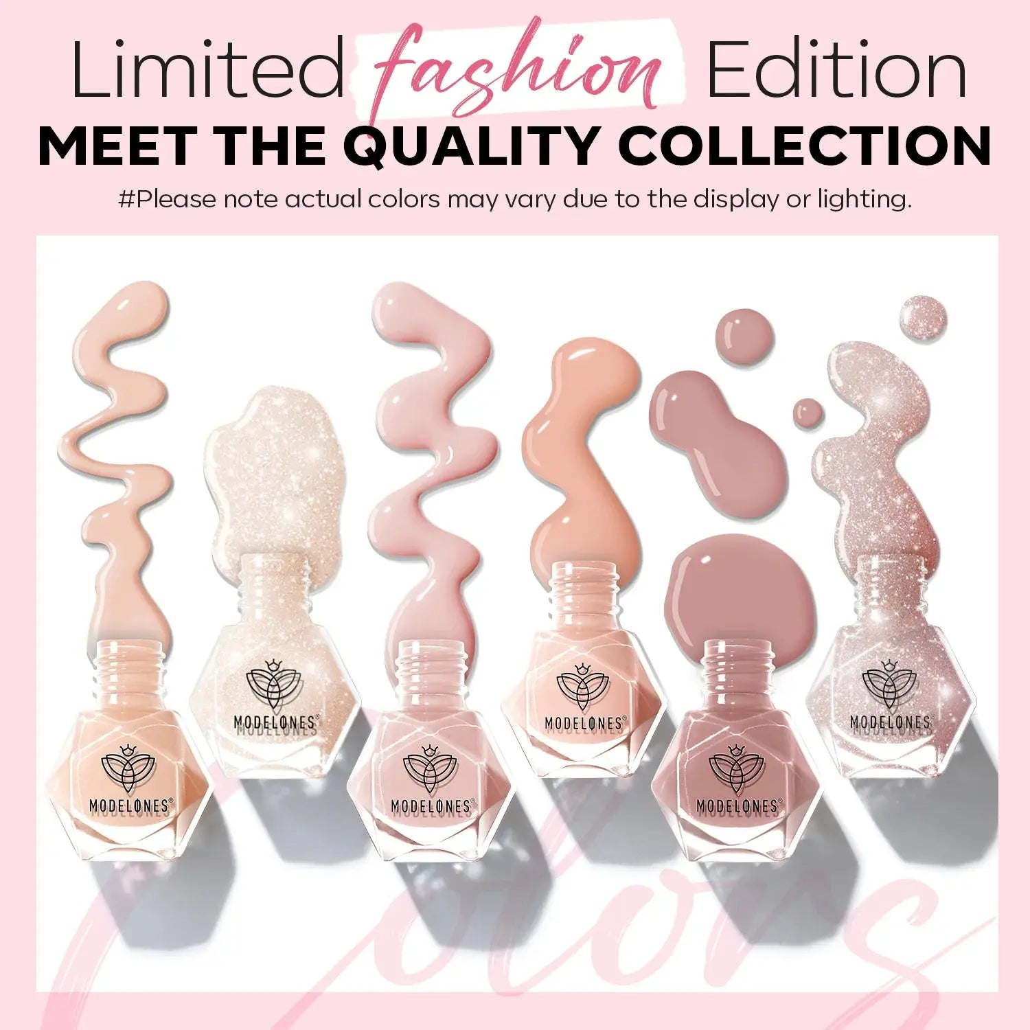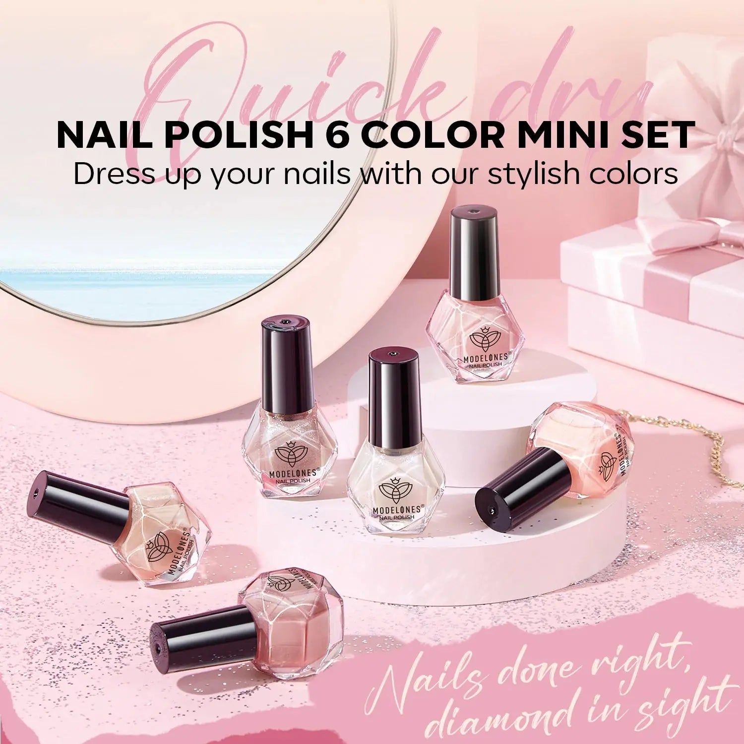 De Modelones Nail Polish Champagne Problem is hét lakje dat jouw nagels instant on fleek maakt: zonder gedoe met lampen of lange droogtijden! Deze set bevat zachte roze tinten, waarvan twee kleuren zijn verrijkt met een prachtige glitter finish. Draag ze solo voor een elegante vibe of combineer ze voor een creatieve, speelse look. Wat je ook kiest, jouw mani is altijd een feestje.