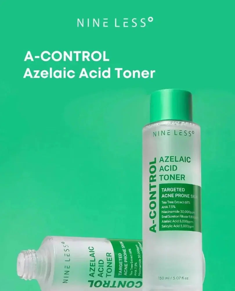 De Nine Less A-Control Azelaic Acid Toner is jouw nieuwe favoriete toner als je last hebt van onzuiverheden, roodheid of een gevoelige huid die wel wat extra liefde kan gebruiken. Deze exfoliërende toner zit boordevol krachtige ingrediënten zoals azelaïnezuur, tea tree-bladwater en AHA’s om puistjes te kalmeren, poriën schoon te houden en je huid weer in balans te brengen.
