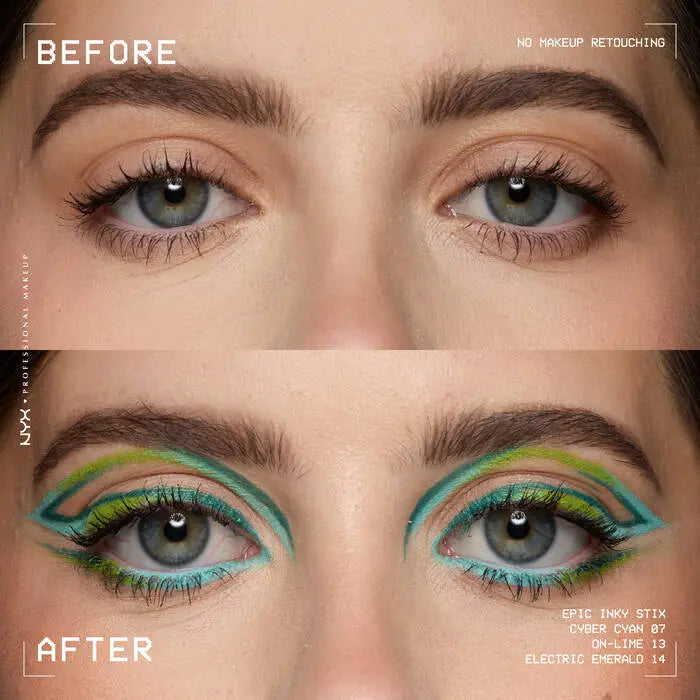 De NYX Professional Makeup Epic Inky Stix Eyeliner Cyber Cyan is dé eyeliner voor wie durft op te vallen. Deze felle cyanblauwe gel eyeliner zorgt voor een intense kleur boost in één swipe, met een fluweelzachte textuur die moeiteloos over de huid glijdt. Ideaal voor opvallende liner looks, edgy details of een pop of color in je waterlijn.