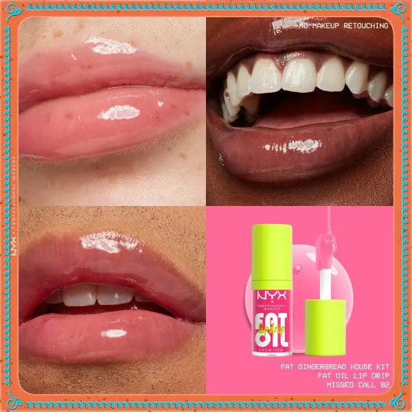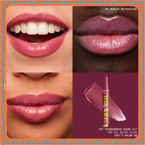 De NYX Professional Makeup Holiday Fat Gingerbread House Kit is het ultieme lipverwenpakket voor de feestdagen! Deze feestelijke limited-edition set bevat een heerlijke mix van Fat Oil Lip Drip Lipglosses en Fat Oil Slick Click Lippenbalsems geïnspireerd op de warmte, gezelligheid en zoetheid van een versierd peperkoekhuisje.