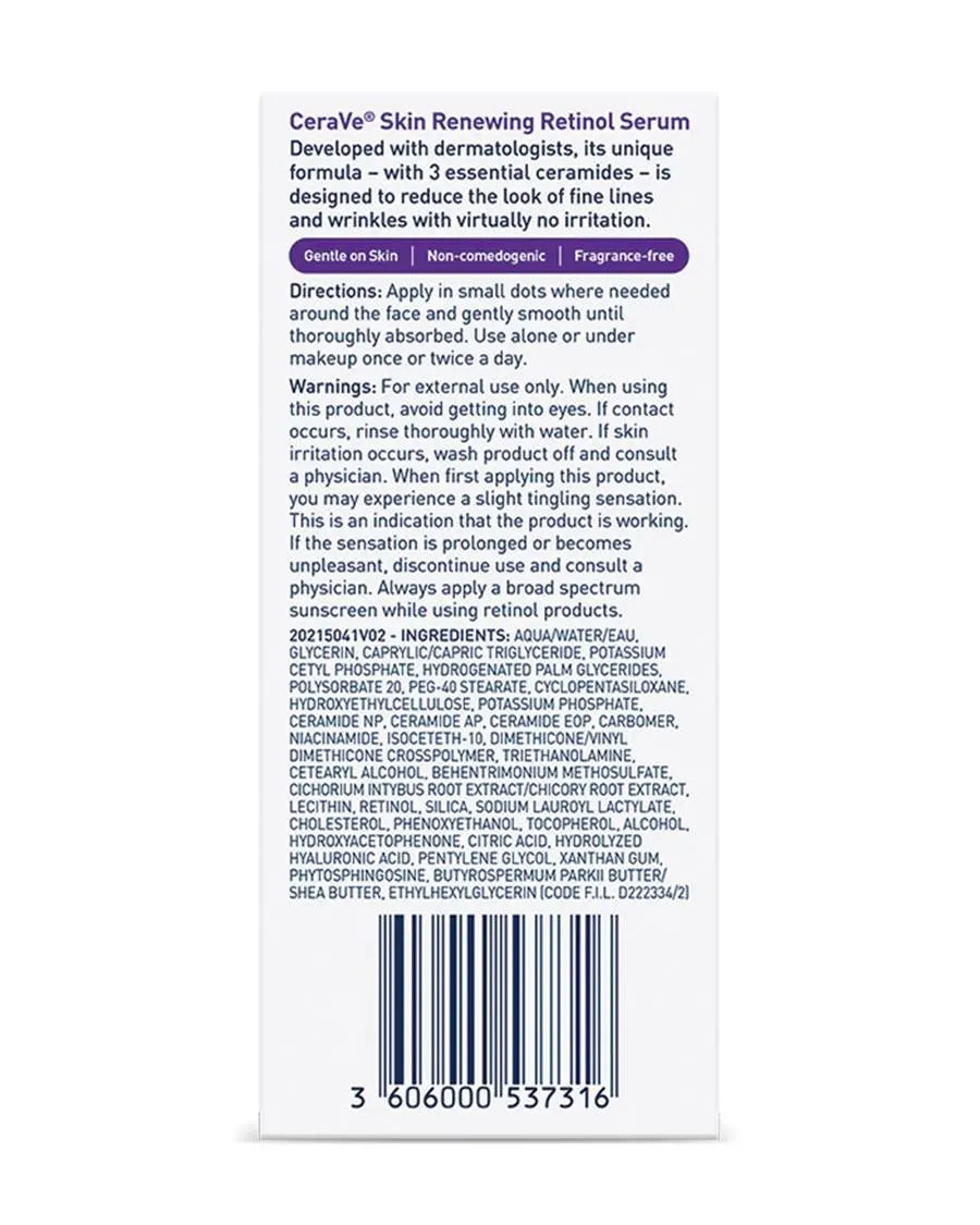 Het CeraVe Skin Renewing Retinol Serum is jouw go-to serum voor een gladdere, egalere en frissere huid. Deze formule combineert retinol met hydraterende en kalmerende ingrediënten, zodat je kunt genieten van de voordelen van retinol zonder je huid uit te drogen. Dankzij hyaluronic acid krijgt je huid een intense hydratatieboost, niacinamide verzacht en kalmeert, en de drie essentiële ceramiden versterken je huidbarrière en zorgen dat vocht beter wordt vastgehouden.