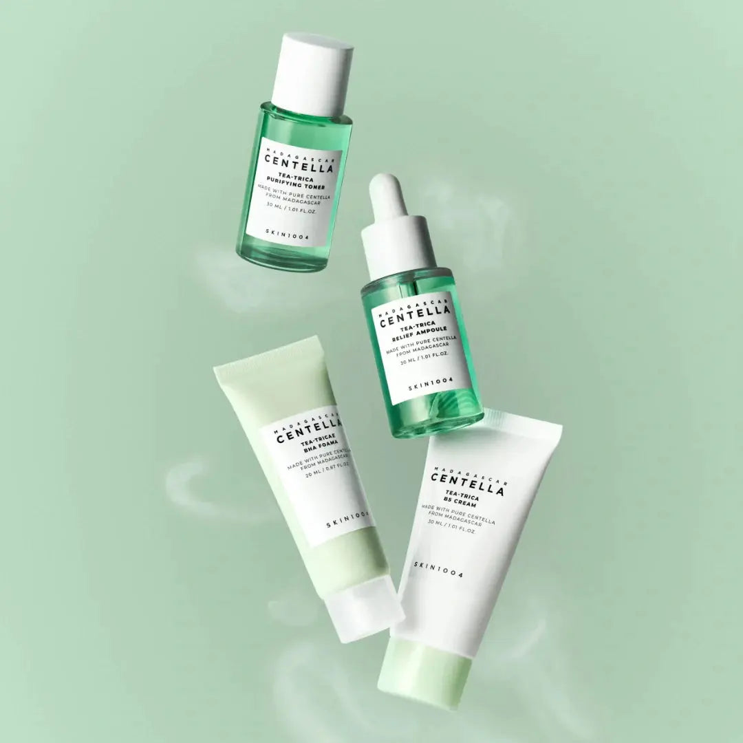 De SKIN1004 Madagascar Centella Tea-Trica Travel Kit is een handige skincare set speciaal ontwikkeld voor een onrustige, onzuivere en snel vette huid. Deze travel set helpt de huid te kalmeren, overtollig talg te verminderen en poriën er schoner en verfijnder uit te laten zien.