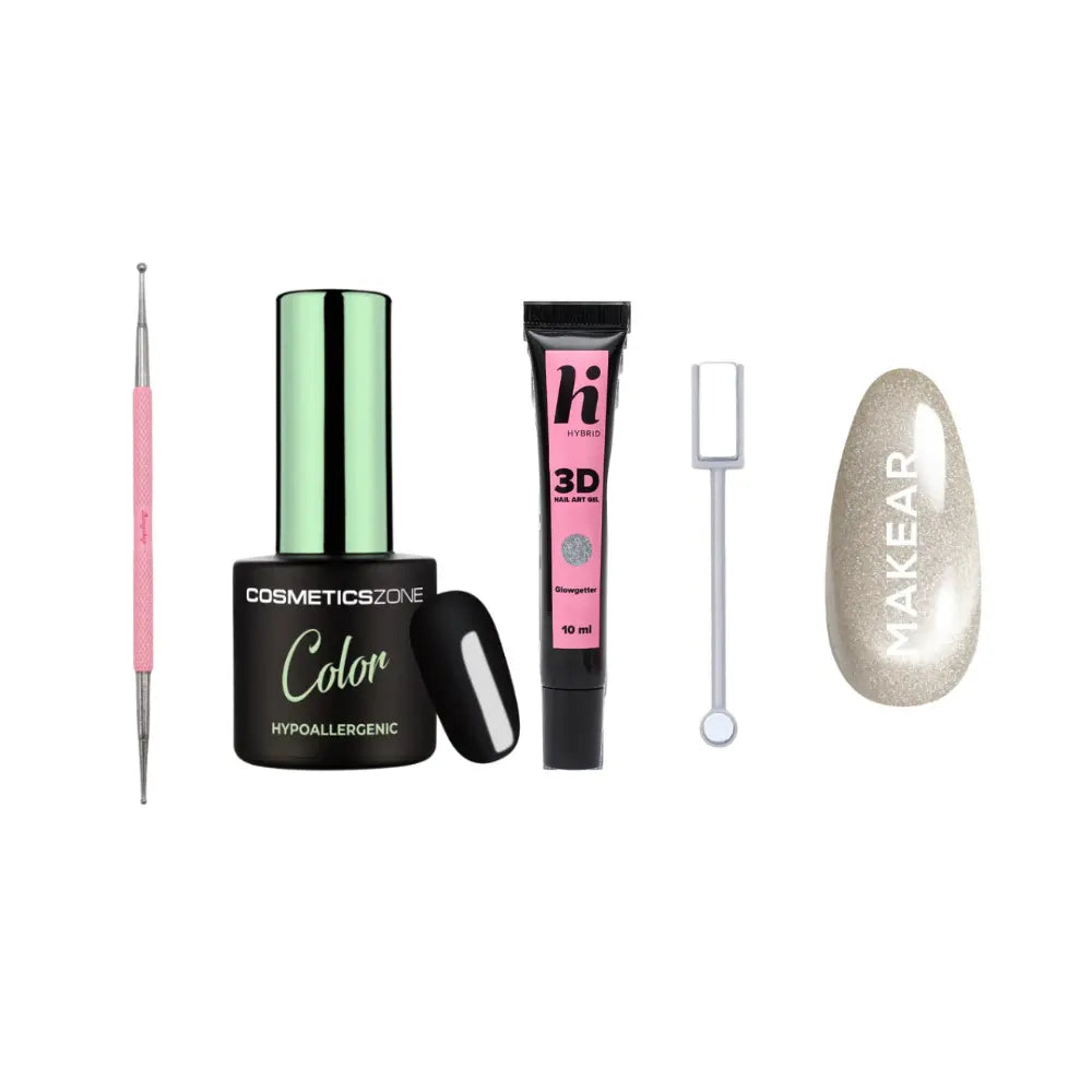 In de set vind je de Cosmetics Zone Hypoallergenic Hybrid UV/LED Gel Polish Black Cat 033, een diepzwarte, hypoallergene gel polish die zorgt voor perfecte dekking en een glossy finish.