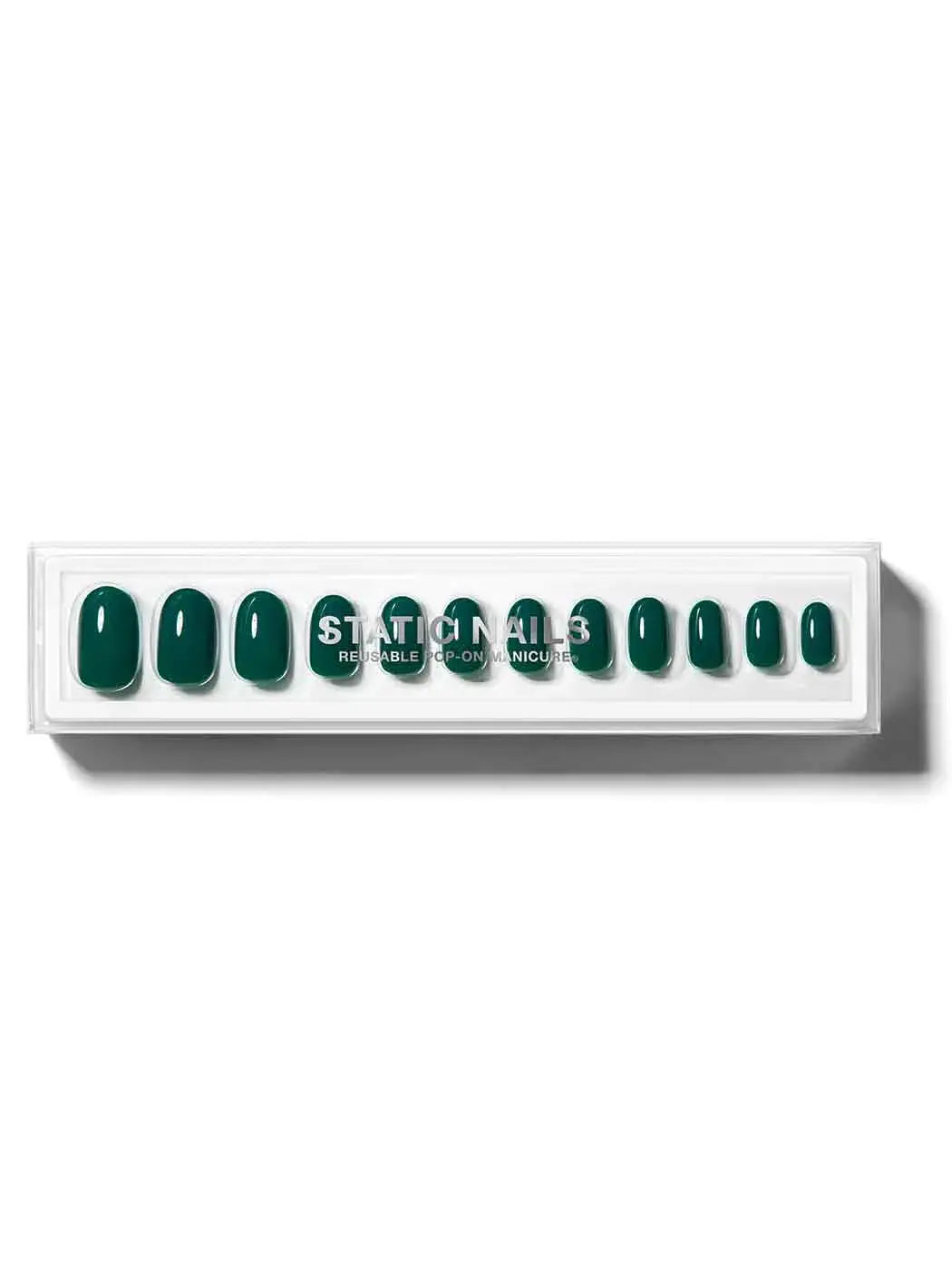 De Static Nails Reusable Pop-On Manicure Emerald Noir Round combineert elegantie met innovatie voor een next-level manicure die jij gewoon zelf thuis aanbrengt. Deze like-acrylic pop-on nagels hebben een klassieke ronde vorm en een chique luxe winter nails kleur: super stijlvol en draagbaar voor elke gelegenheid.