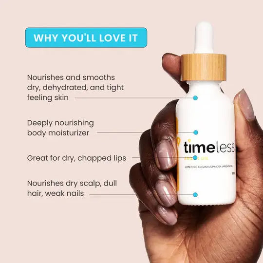 De Timeless Skin Care Argan Oil 100% Pure is echt zo’n multitasker die je altijd in huis wilt hebben. Deze 100% natuurlijke, ongeraffineerde olie uit Marokko, ook wel 'liquid gold' genoemd, is een redder in nood voor droge huid, dof haar, broze nagels en zelfs schrale lippen. En ja, dat allemaal in één product!