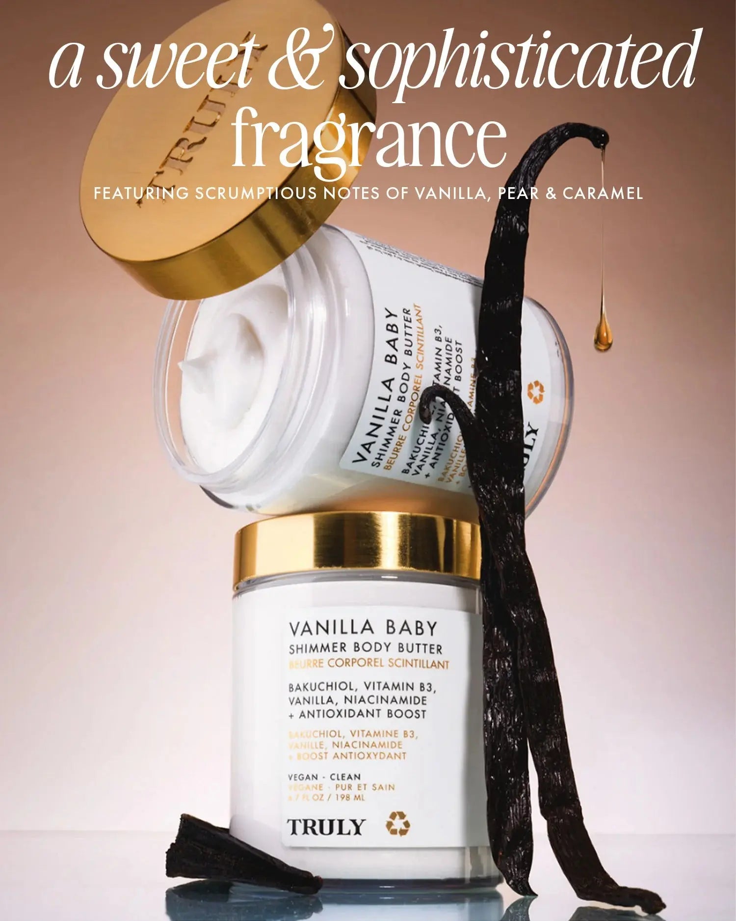 De Truly Beauty Vanilla Baby Shimmer Body Butter is een luxe, romige moisturizer die je huid direct laat stralen. Dankzij de reflecterende parel pigmenten krijgt je huid een zachte, pearlescent glow die er super chic uitziet.